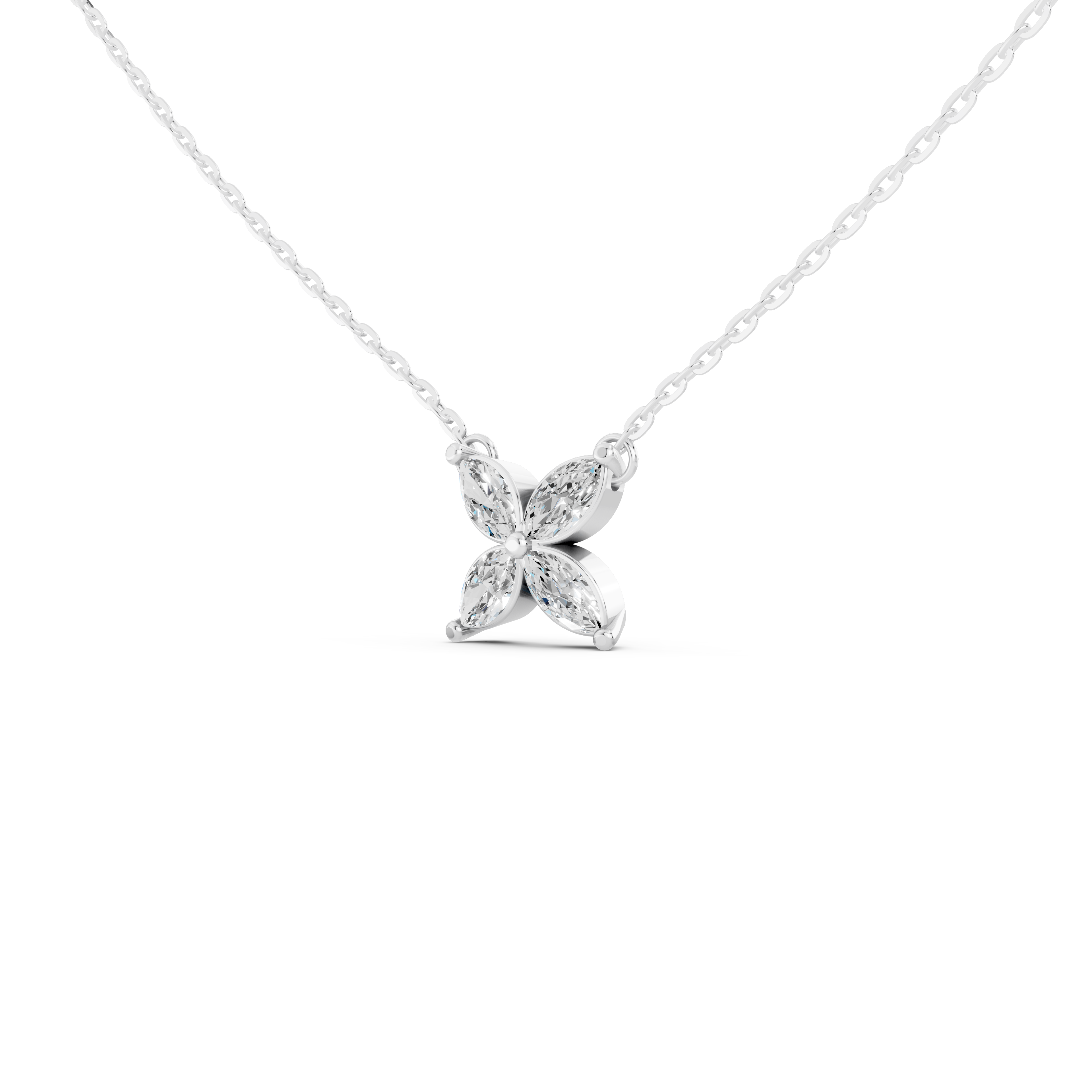 Dây chuyền nữ Kim cương Vàng trắng 18K VCR DN-0105 được chế tác công phu trong phòng chế tác riêng nhà Vĩnh Cara, tạo nên món trang sức tinh xảo hơn, đẳng cấp hơn. DN-0105 tỏa sáng với 4 viên kim cương Marquise 6.4x3.2 ly lấp lánh được sắp xếp tỉ mỉ trên một bông hoa xinh xắn, tạo nên vẻ đẹp vừa đơn giản vừa tinh tế. Hình ảnh bông hoa tiên xinh đẹp ở mặt dây chuyền mang đến một thông điệp về sự dịu dàng, thanh thoát và vẻ đẹp không phai mờ theo thời gian.