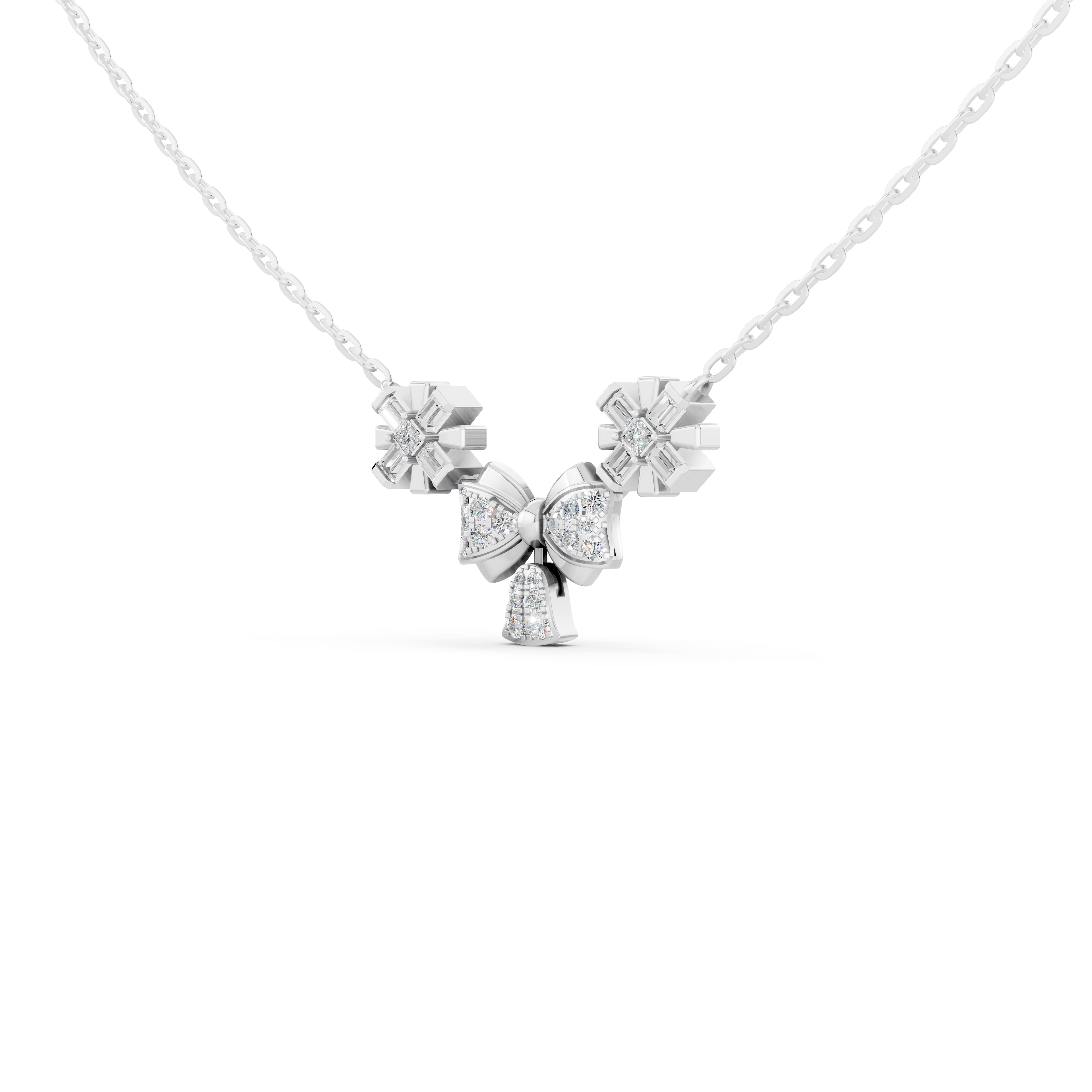 Thiết kế inh xảo: Mặt dây chuyền có sự xuất hiện của một chiếc nơ xinh xắn và hai bông hoa nhỏ được đính kim cương lấp lánh. Những đường nét uốn lượn mềm mại của chiếc dây chuyền tạo ra một cảm giác sang trọng nhưng cũng đầy nữ tính.
