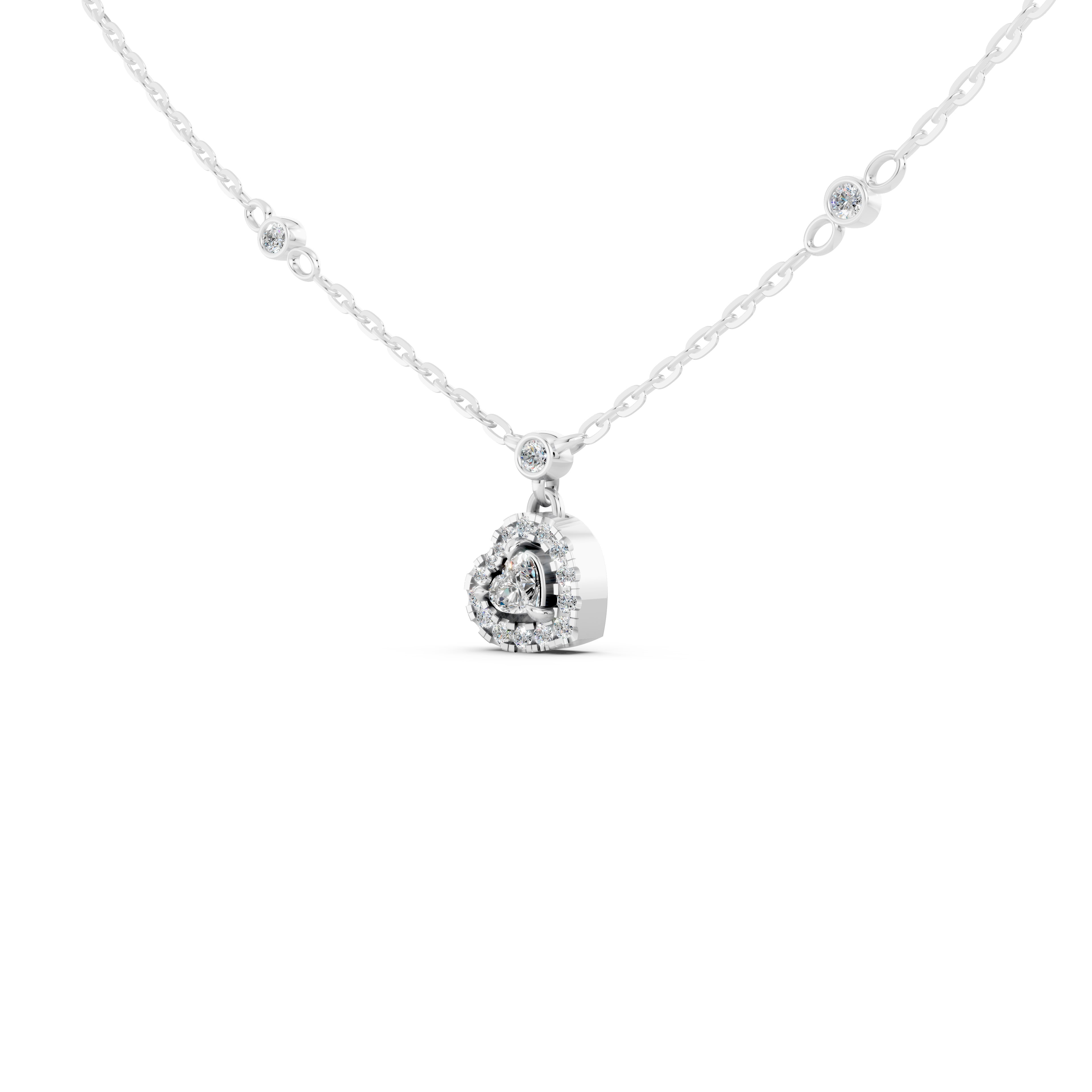 Được chế tác từ vàng trắng 18K kết hợp với kim cương cao cấp tạo nên sợi dây chuyền mang đậm dấu ấn đẳng cấp. Điểm nhấn đặc biệt nằm ở thiết kế trái tim kim cương 3ly7 lấp lánh nằm ở trung tâm – một hình ảnh mang ý nghĩa biểu tượng về tình cảm chân thành và sự gắn kết vững bền. Bao quanh trái tim kim cương là vòng Halo rực rỡ, đính kết những viên kim cương tấm nhỏ li ti, tạo hiệu ứng ánh sáng thu hút từ mọi góc nhìn, tựa như cách tình cảm chân thành luôn được trân trọng và gìn giữ.