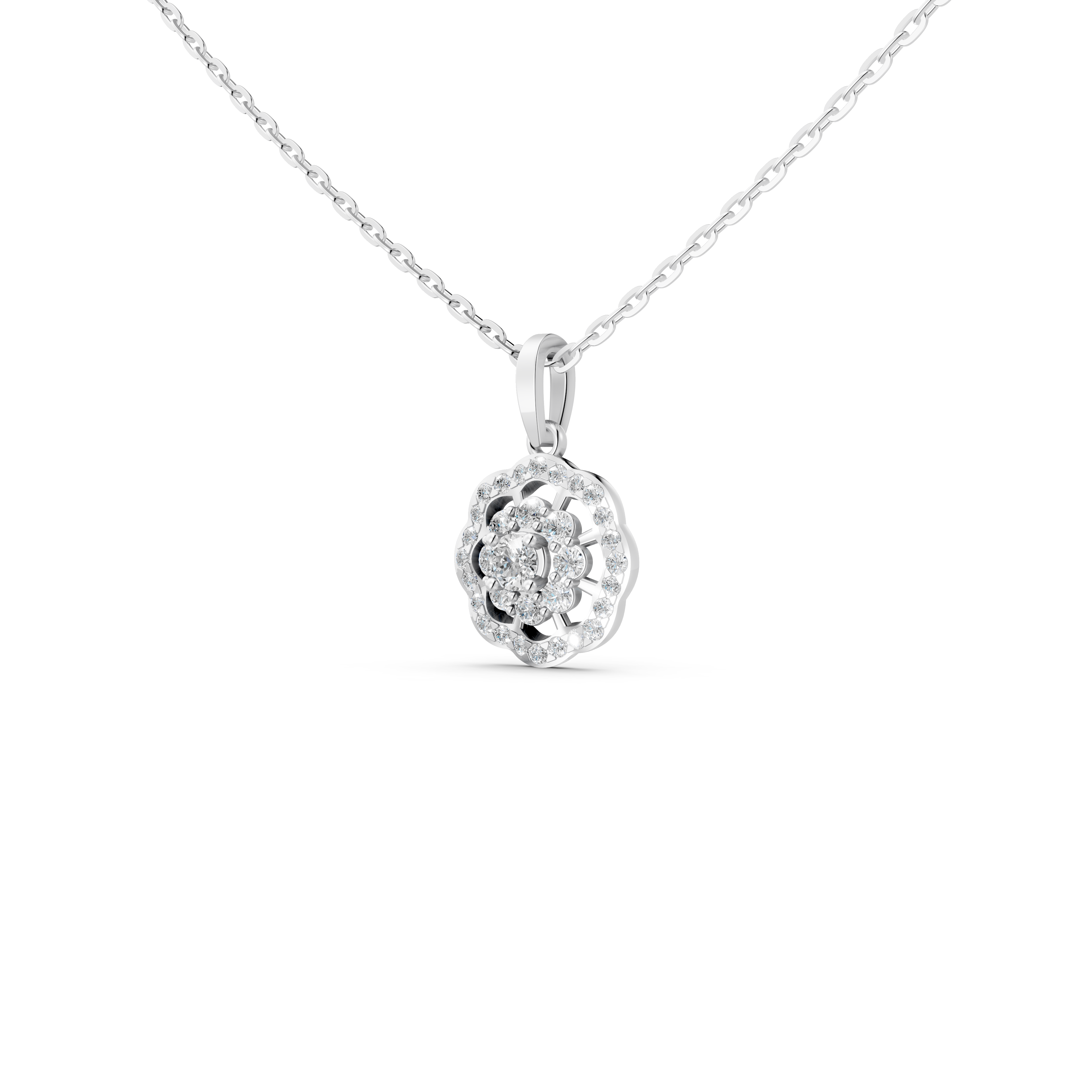 Với cảm hứng từ hình ảnh của một đóa hoa yêu kiều đang khoe sắc rạng ngời, thiết kế nổi bật với viên kim cương trung tâm được bao quanh bởi “vầng hào quang” của nhiều viên tấm nhỏ xung quanh. Những vòng đá được tạo hình trau chuốt như cánh hoa, tạo nên hiệu ứng đầy lấp lánh khi chuyển động. Mọi chi tiết đều nhằm để tôn lên vẻ đẹp thuần khiết, rực rỡ của người phụ nữ hiện đại.