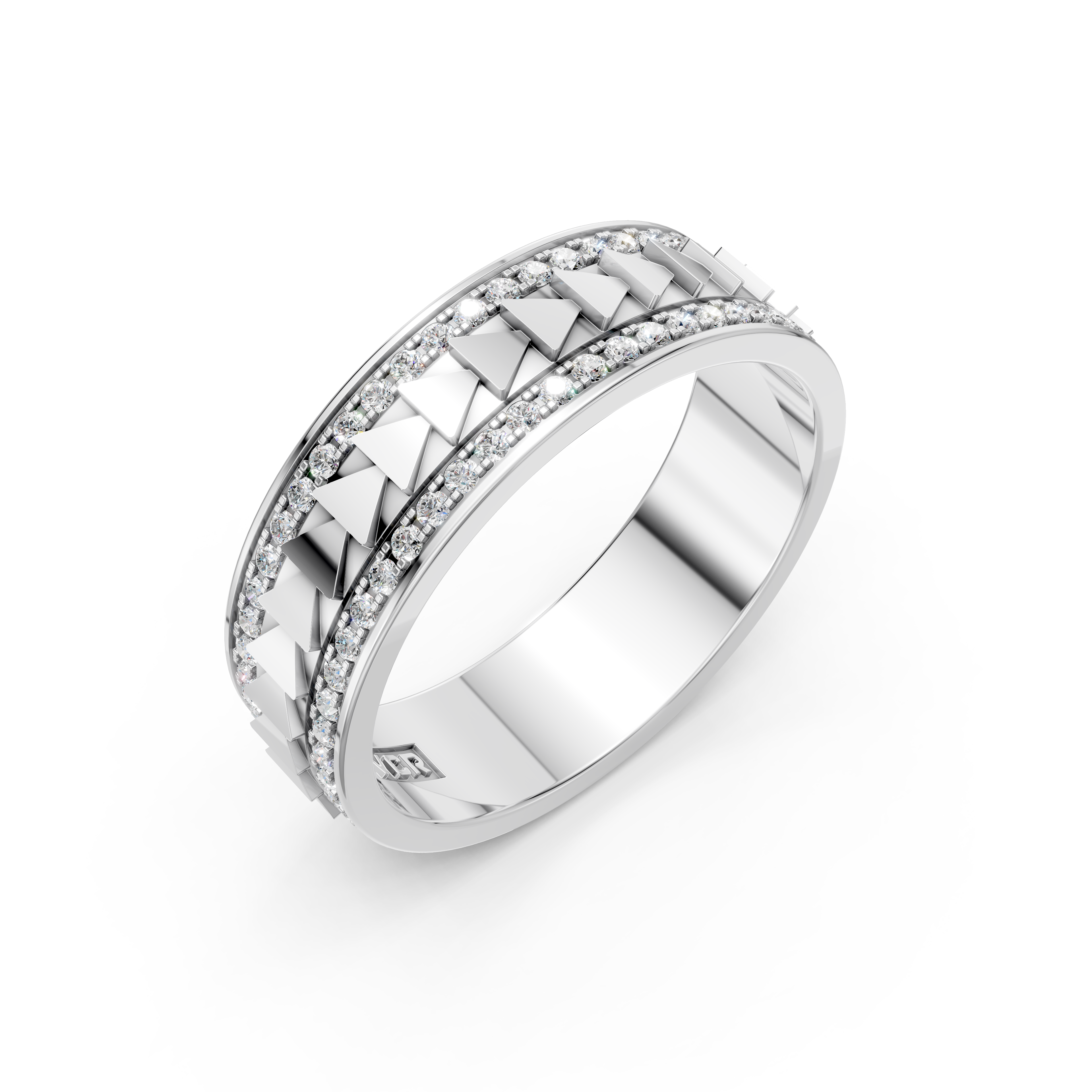Kim cương: Đai nhẫn đính kết 110 viên kim cương 0.9 ly được sắp xếp tinh tế, tiếp nối nhau thành một dải ánh sáng tiếp nối liên tục. Thiết kế này tạo điểm nhấn lấp lánh, mang ý nghĩa sâu sắc về tình yêu vĩnh cửu.