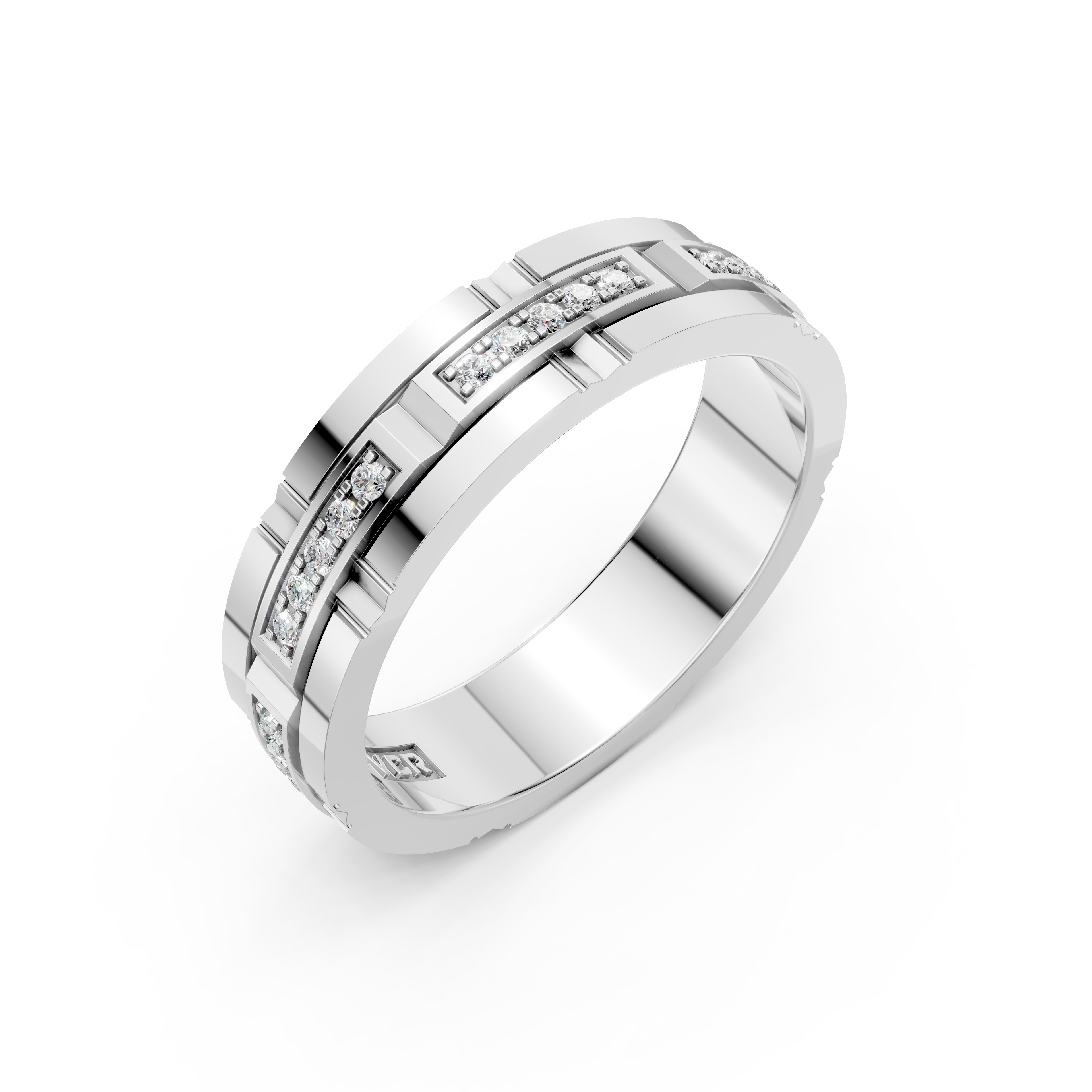 Đá quý: Mẫu nhẫn cưới này nổi bật với 35 viên kim cương tấm 1.0 ly được đính dọc theo đai nhẫn, tạo nên một hiệu ứng lấp lánh và sang trọng. Những viên kim cương này đại diện cho khoảnh khắc quý giá trong tình yêu và gắn kết giữa hai người.