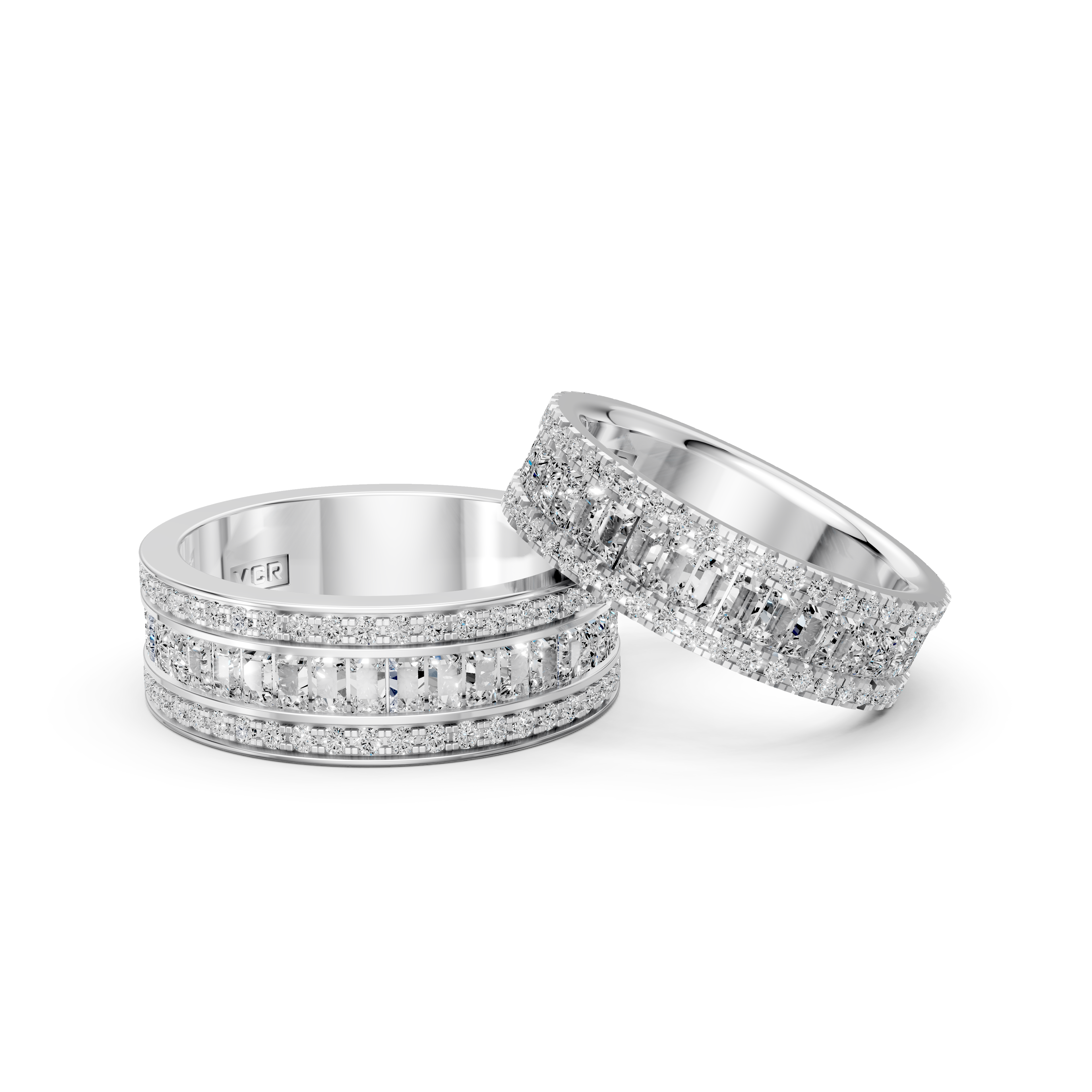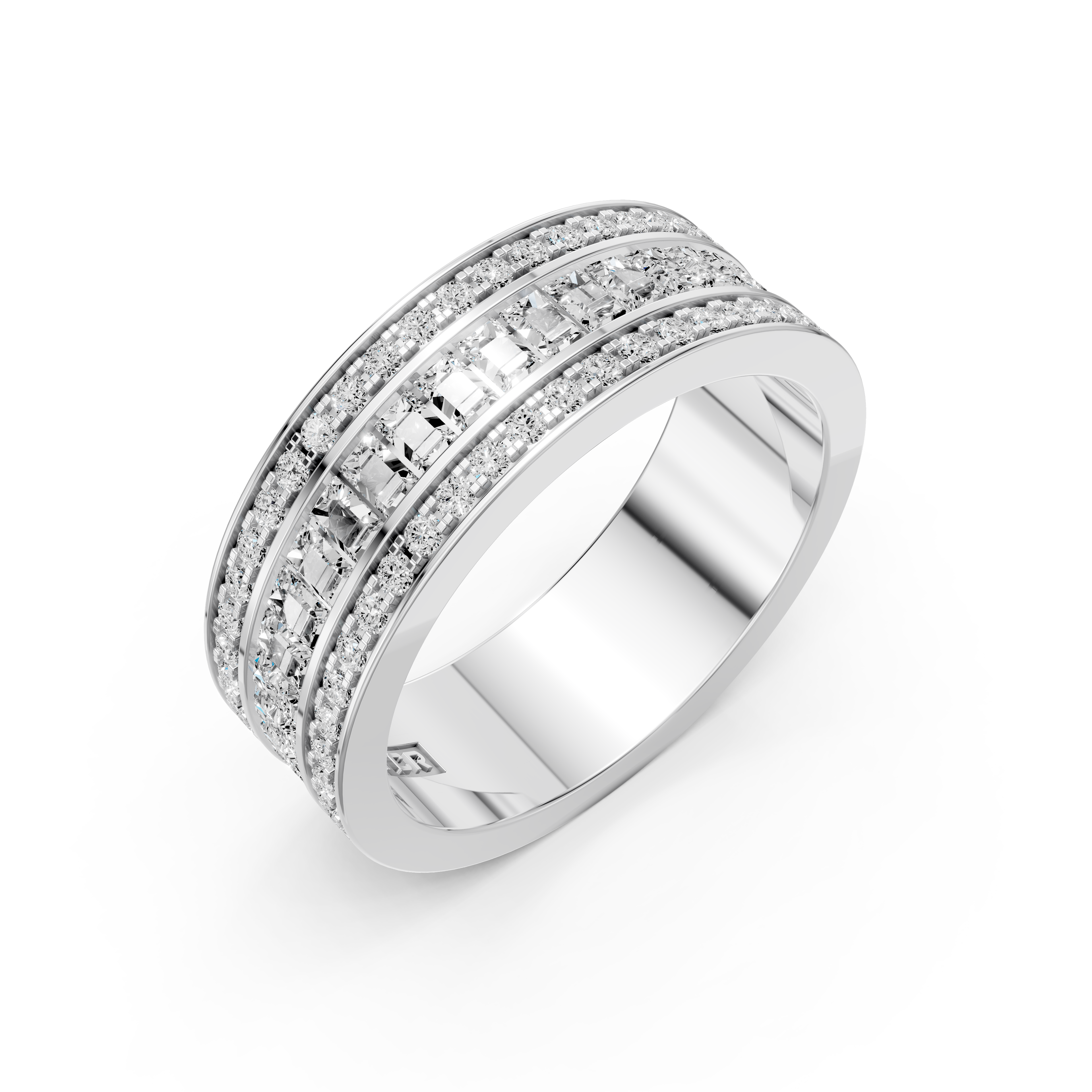Mặt nhẫn được đính kết 3 dải kim cương lấp lánh, mỗi dải kim cương đều được sắp xếp một cách tỉ mỉ và tinh tế. Dải kim cương Baguette nằm ở vị trí trung tâm, tạo điểm nhấn nổi bật, được bao quanh bởi hai dải kim cương Round sắc nét, tạo nên sự cân đối hoàn hảo. Chất liệu vàng trắng 18K làm tăng thêm vẻ đẹp sang trọng và bền vững cho chiếc nhẫn, đồng thời tôn lên ánh sáng lấp lánh của những viên kim cương.