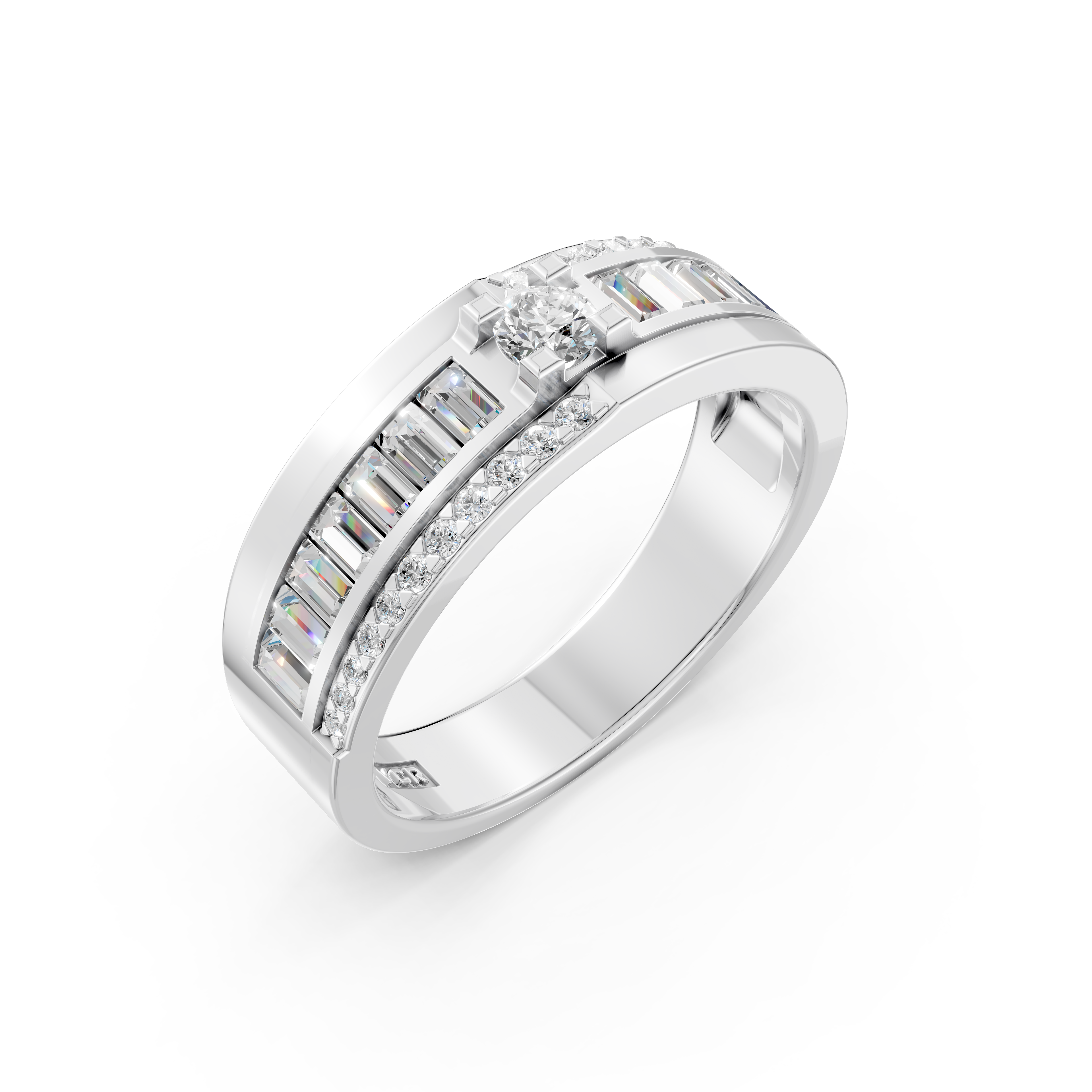 Đai nhẫn được thiết kế độc đáo với một dải kim cương Round và một dải kim cương Baguette tạo nên sự kết hợp hài hòa. Các viên kim cương Round với vẻ đẹp mềm mại, uyển chuyển, được đính kết xen kẽ với các viên kim cương Baguette sắc nét, làm tăng thêm sự tinh tế và sang trọng cho chiếc nhẫn.