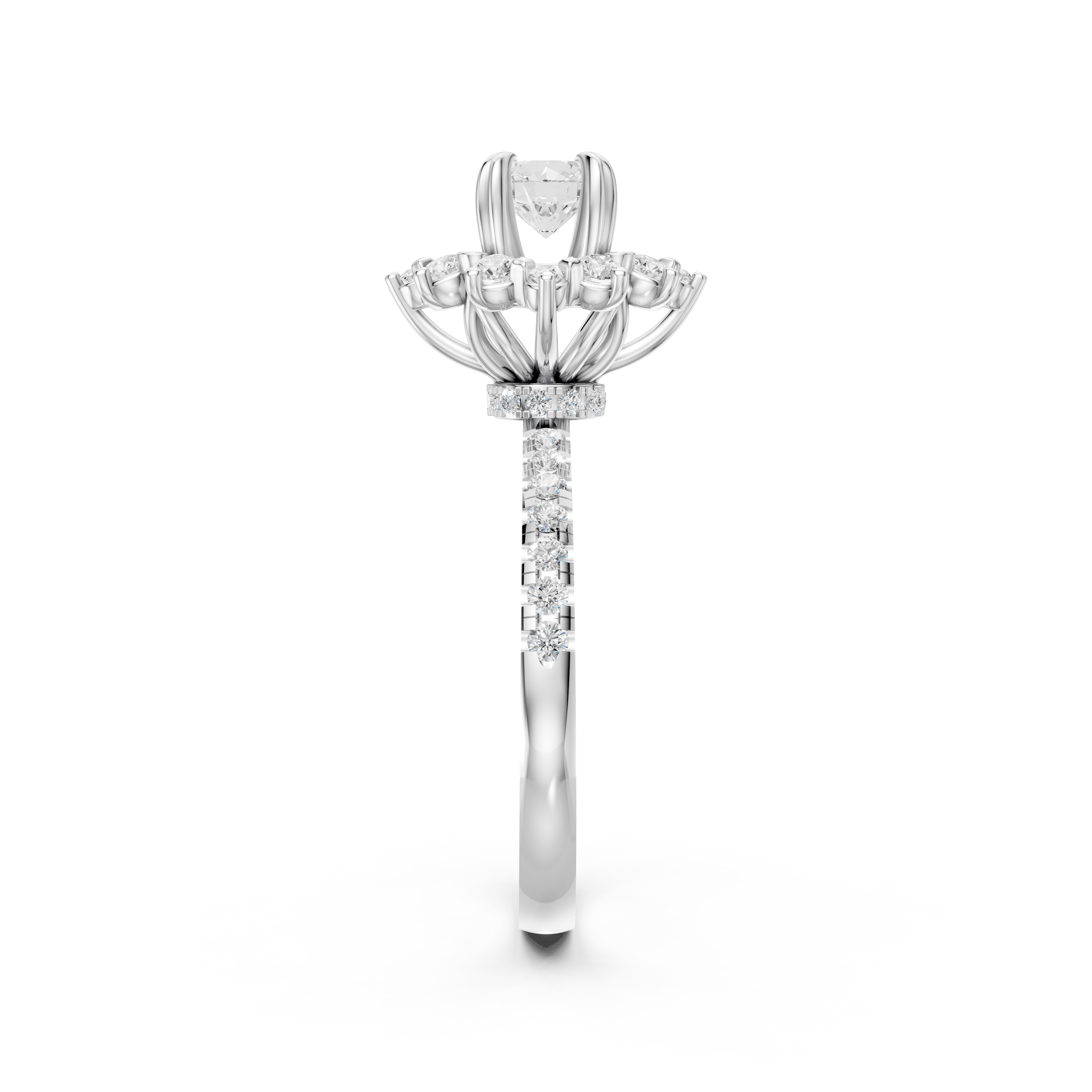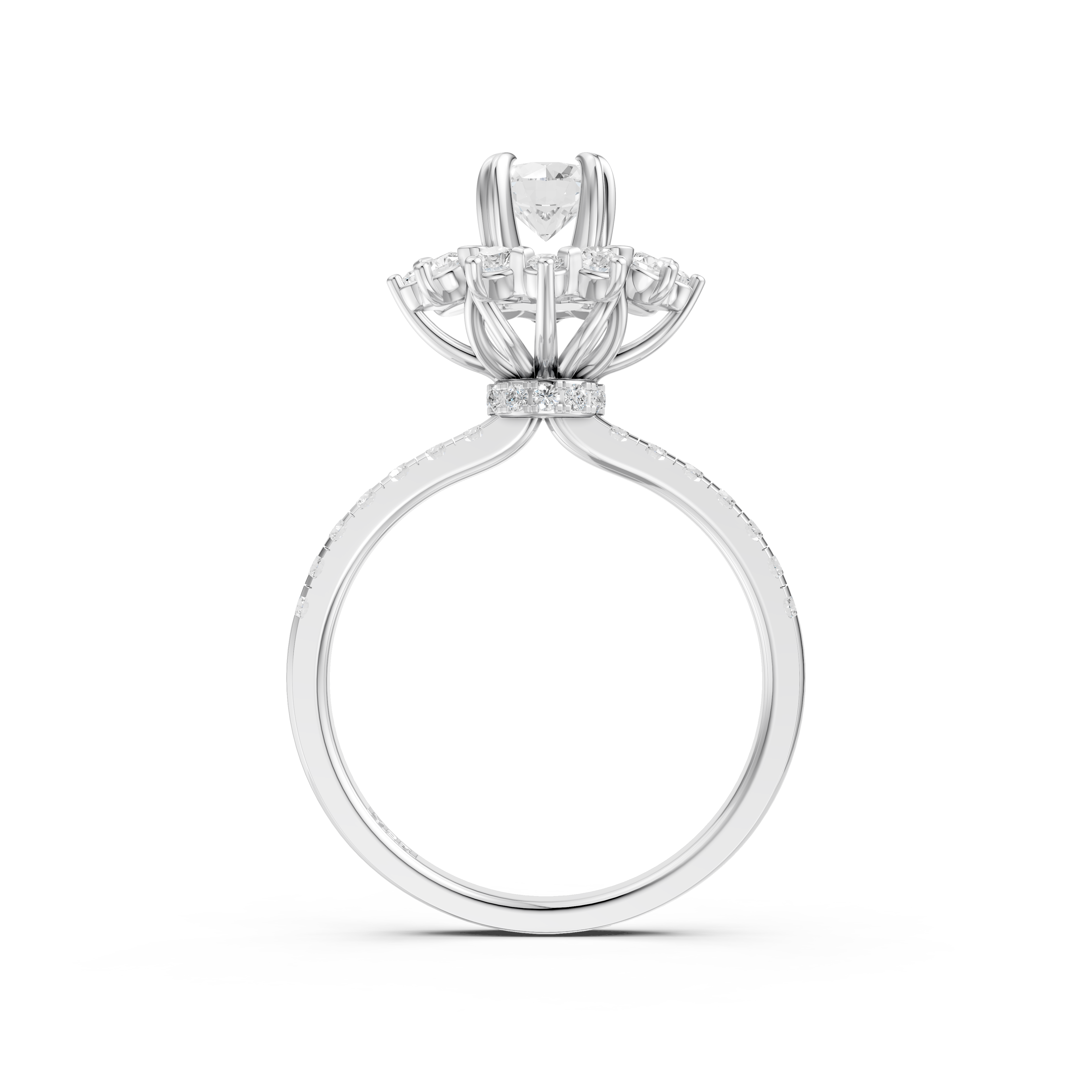 Với phần đế nhẫn được chế tác tỉ mỉ, các đường nét uốn lượn giống như nhụy hoa nâng đỡ viên kim cương chính, chiếc nhẫn mang lại cảm giác thanh thoát và đầy quyến rũ. Viên kim cương trung tâm được cắt gọt hoàn hảo, lấp lánh rực rỡ, bao quanh là những cánh hoa nhỏ với những viên kim cương nhỏ được đính tỉ mỉ. Dọc theo thân nhẫn là dãy kim cương nhỏ được đính tỉ mỉ, tạo nên vẻ đẹp rực rỡ từ mọi góc nhìn. Thiết kế này không chỉ mang lại cảm giác cổ điển mà còn mang hơi thở hiện đại, phù hợp cho những dịp đặc biệt như đính hôn hay làm quà tặng cho người thân yêu.