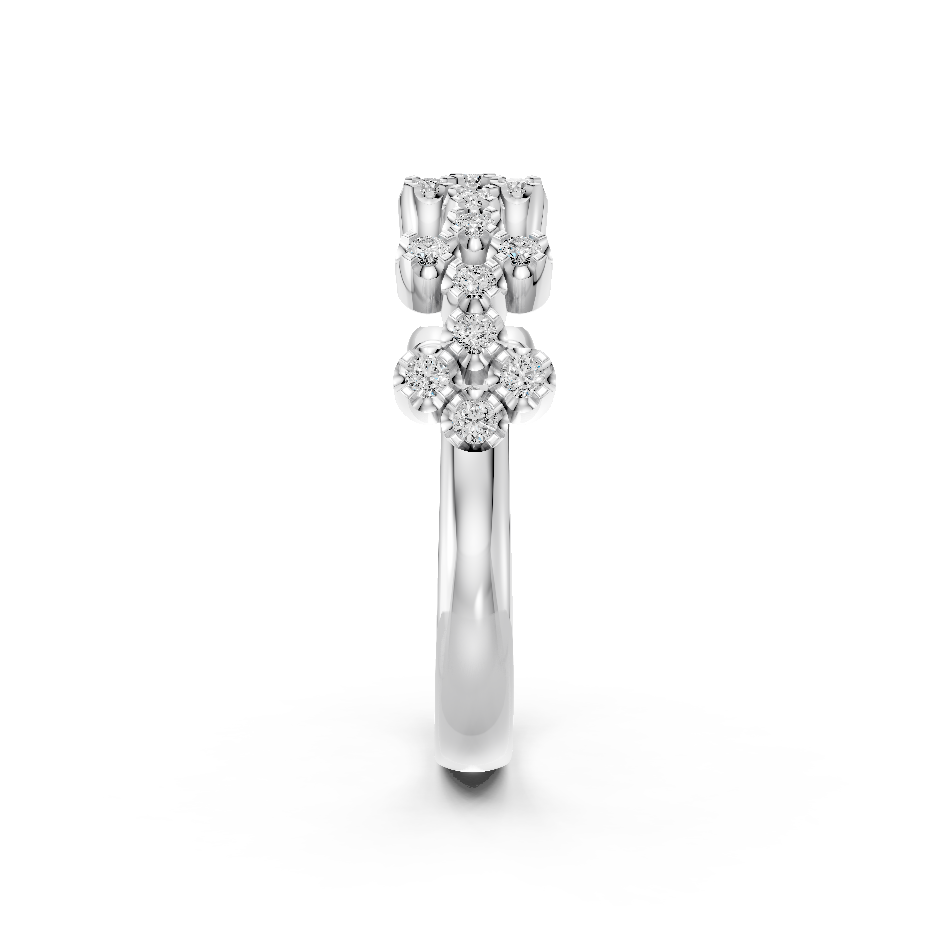 Chiếc nhẫn được lấy cảm hứng từ hình ảnh những cánh hoa nhí mỏng manh nhưng kiên cường, tượng trưng cho vẻ đẹp thanh khiết và sự mạnh mẽ nội tại của người phụ nữ. Từng viên kim cương nhỏ được sắp xếp một cách tỉ mỉ để tạo nên một tổng thể hài hòa, giống như những bông hoa nhỏ kết thành vòng nguyệt quế tỏa sáng.