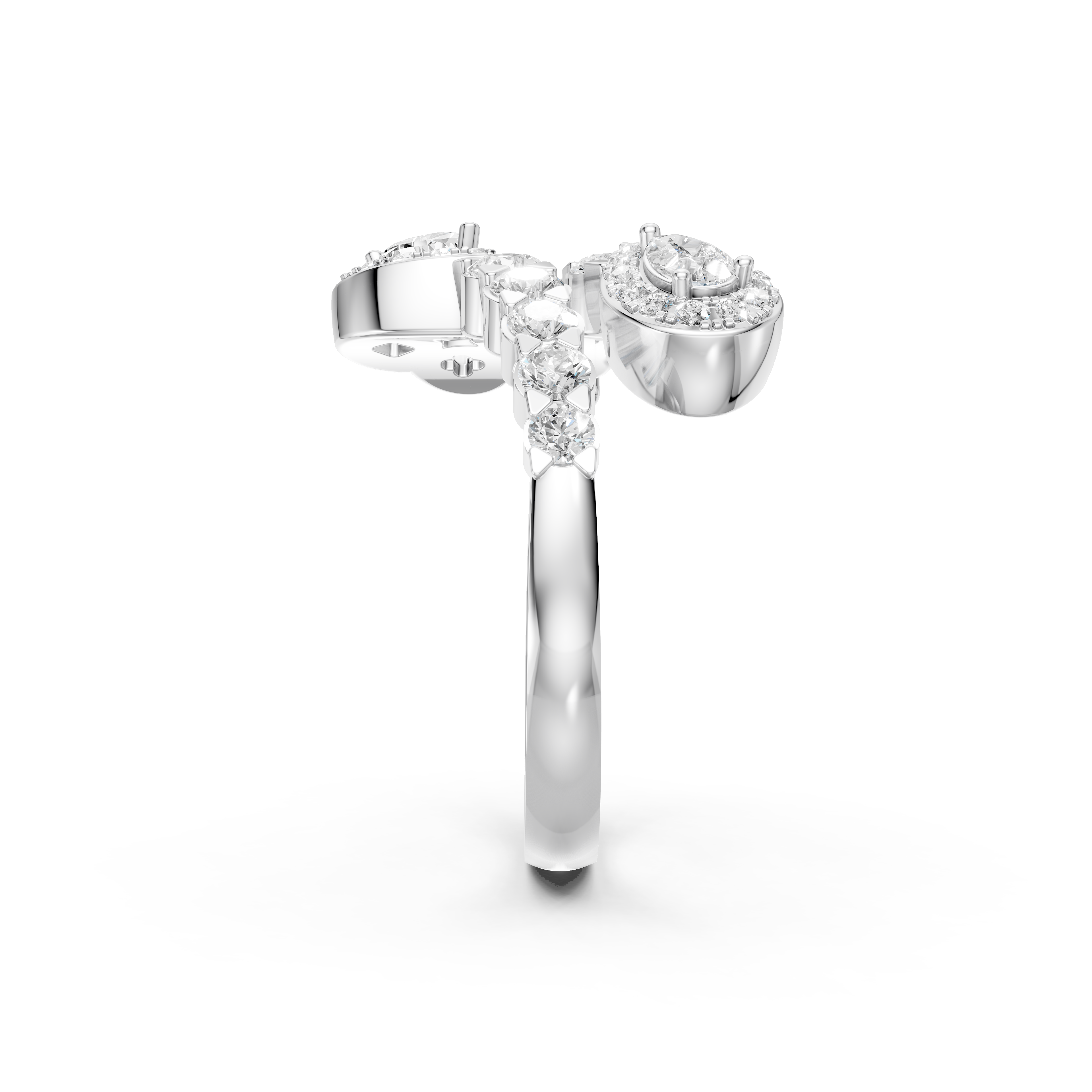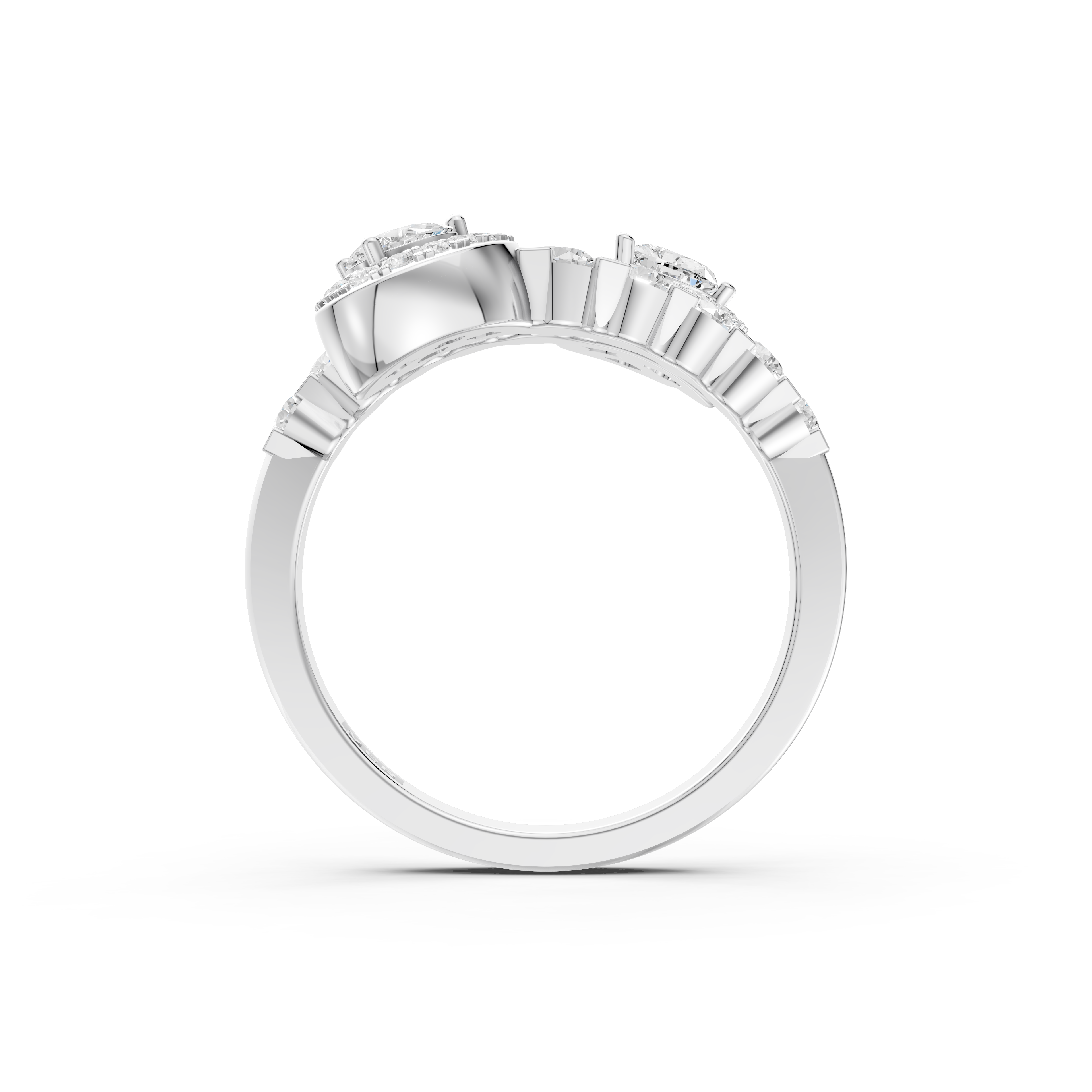 Kiểu dáng Twin: Chiếc nhẫn là sự giao hòa theo lối Twin giữa kim cương Pear và Heart mang lại cảm giác lãng mạn, cổ điển nhưng vẫn rực rỡ đầy mê hoặc. Nửa vòng đai nhẫn đính kim cương tấm tạo thành vòng sáng lấp lánh càng tôn lên nét thanh thoát, nhẹ nhàng của đôi bàn tay.