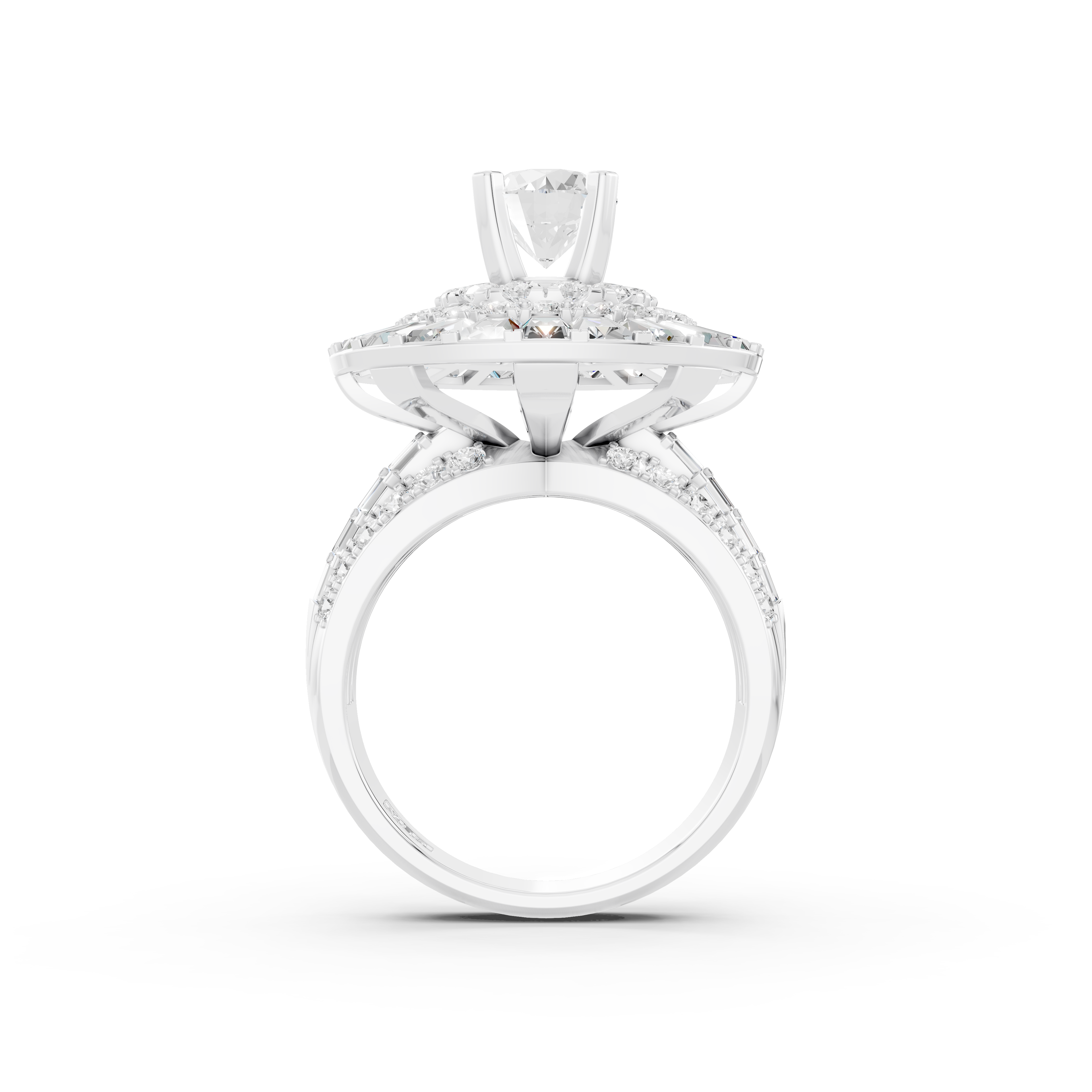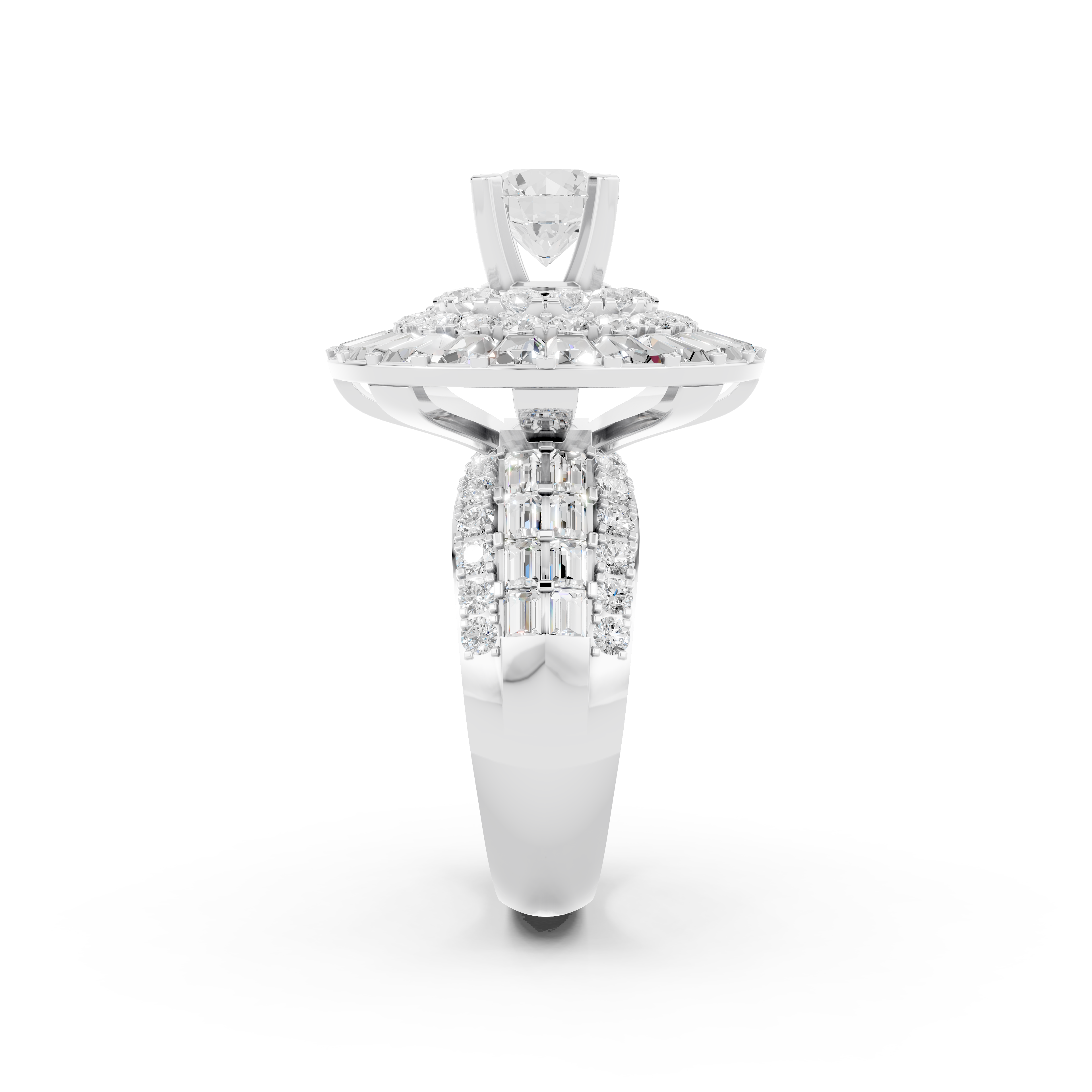 Thiết kế đẹp mắt: Ổ nhẫn và đai nhẫn lớn, được đính kết vô số viên kim cương Round, Baguette và Tapper. Sự sắp xếp của kim cương tấm đã tạo ra tương phản màu sắc giúp cho chiếc nhẫn trở nên lung linh hơn ở mọi góc nhìn.