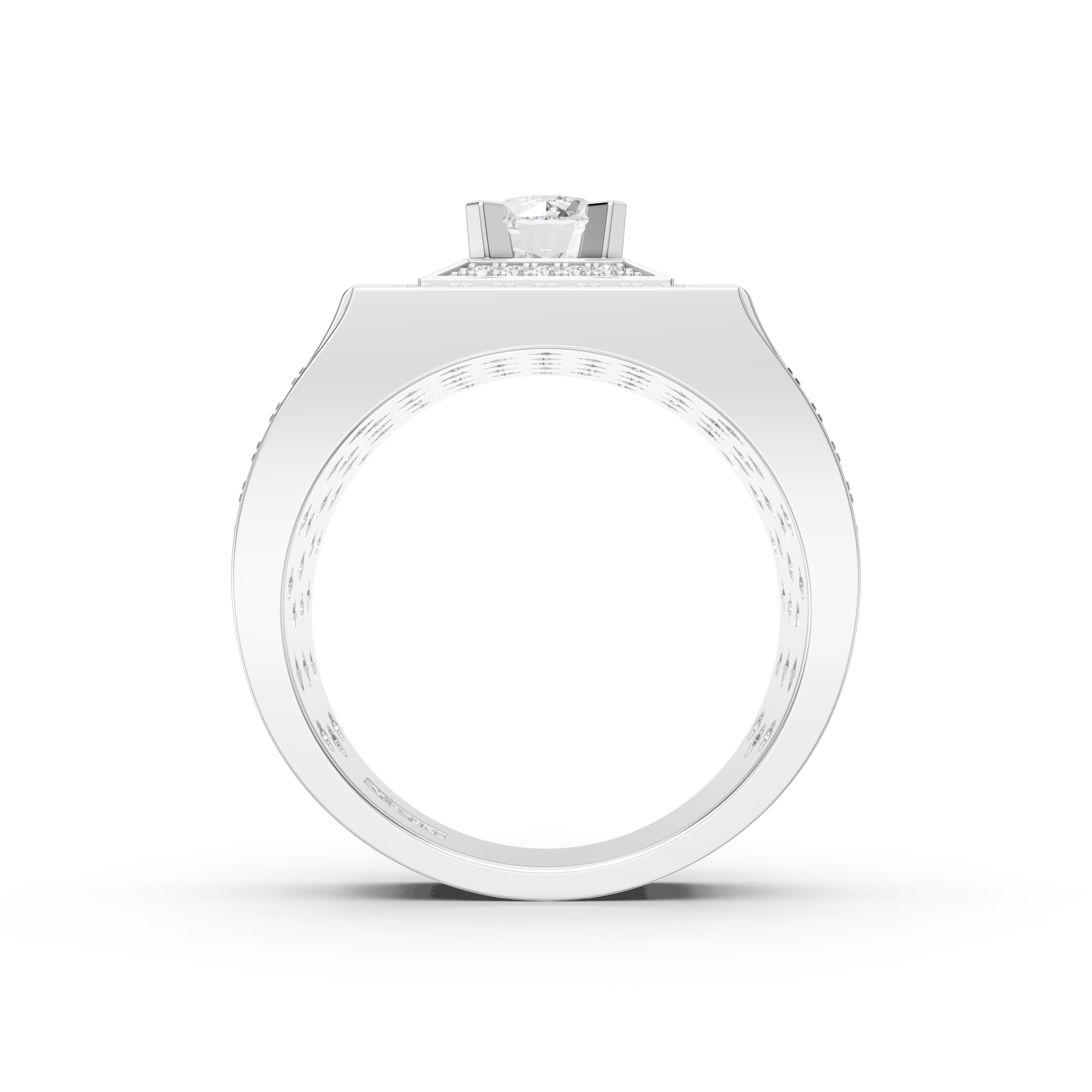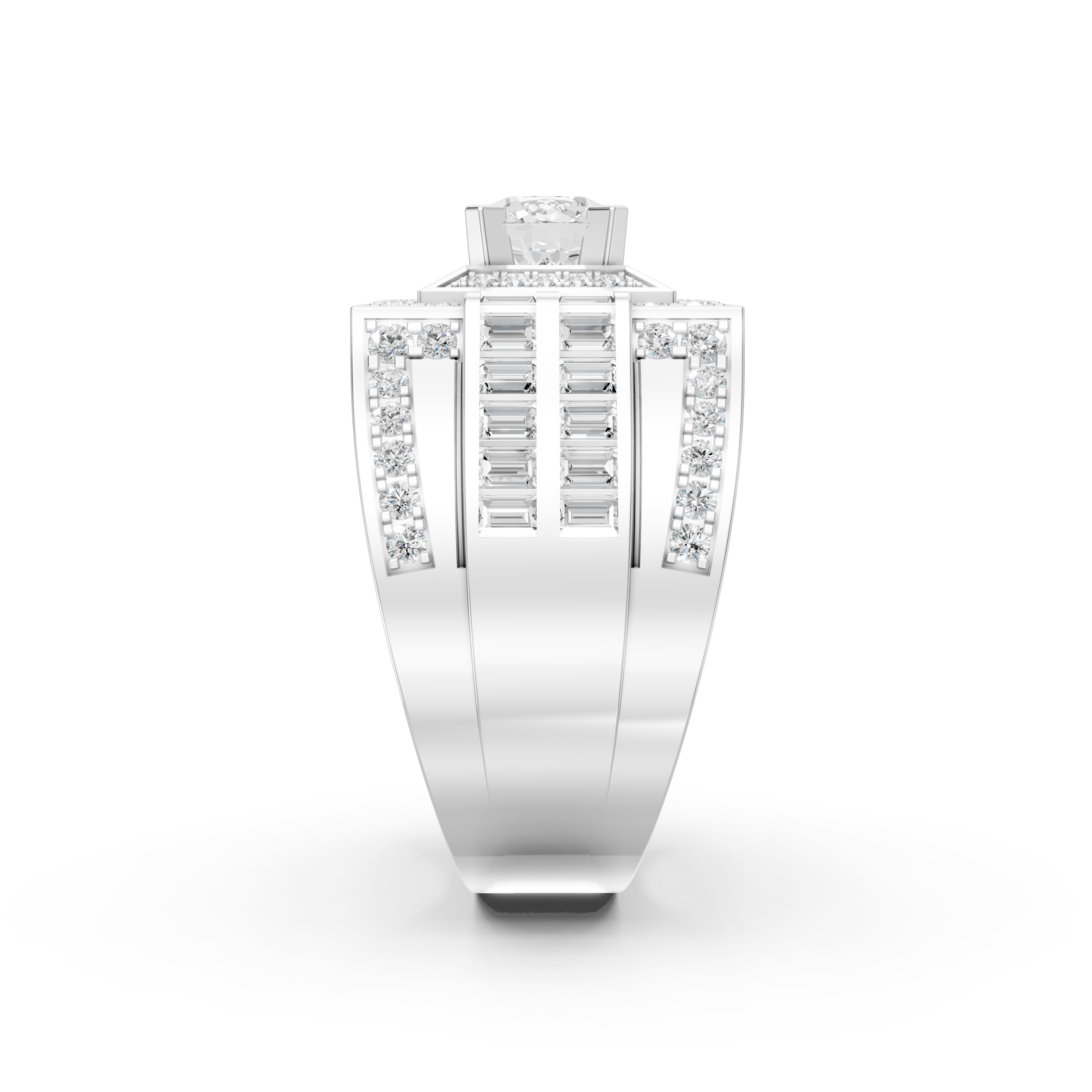 Điểm nhấn đặc biệt của chiếc nhẫn này là viên kim cương chủ 6.0 ly nằm trên mặt nhẫn, chiếm trọn ánh nhìn. Viên kim cương lớn với vẻ ngoài rực rỡ và sắc nét mang đến sự hoàn mỹ tuyệt đối. Phần đai nhẫn được đính kết thêm 24 viên kim cương Baguette (2.3x1.5 ly) và 68 viên kim cương Round (1.1 – 1.6 ly) xếp xen kẽ một cách tinh tế, tạo nên một hiệu ứng ánh sáng tuyệt đẹp và thể hiện sự tinh xảo trong thiết kế.