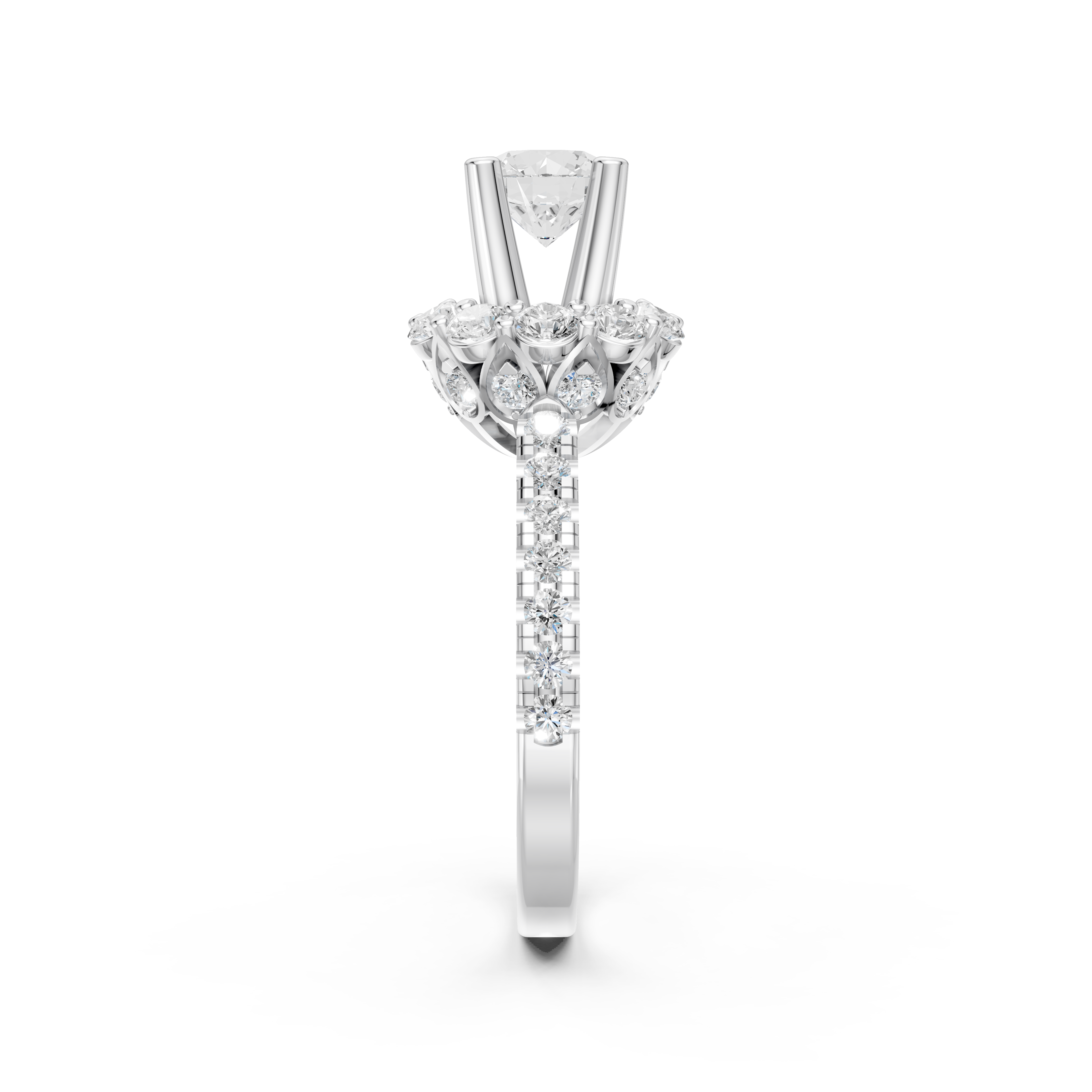Kiểu dáng Cluster độc đáo: Ổ nhẫn được sắp xếp phá cách so với kiểu dáng đơn giản thông thường với chấu cao giúp hack size viên chủ. Bao quanh viên chủ là một vòng kim cương được thiết kế tạo hình thành cánh hoa anh đào đang nở rộ.