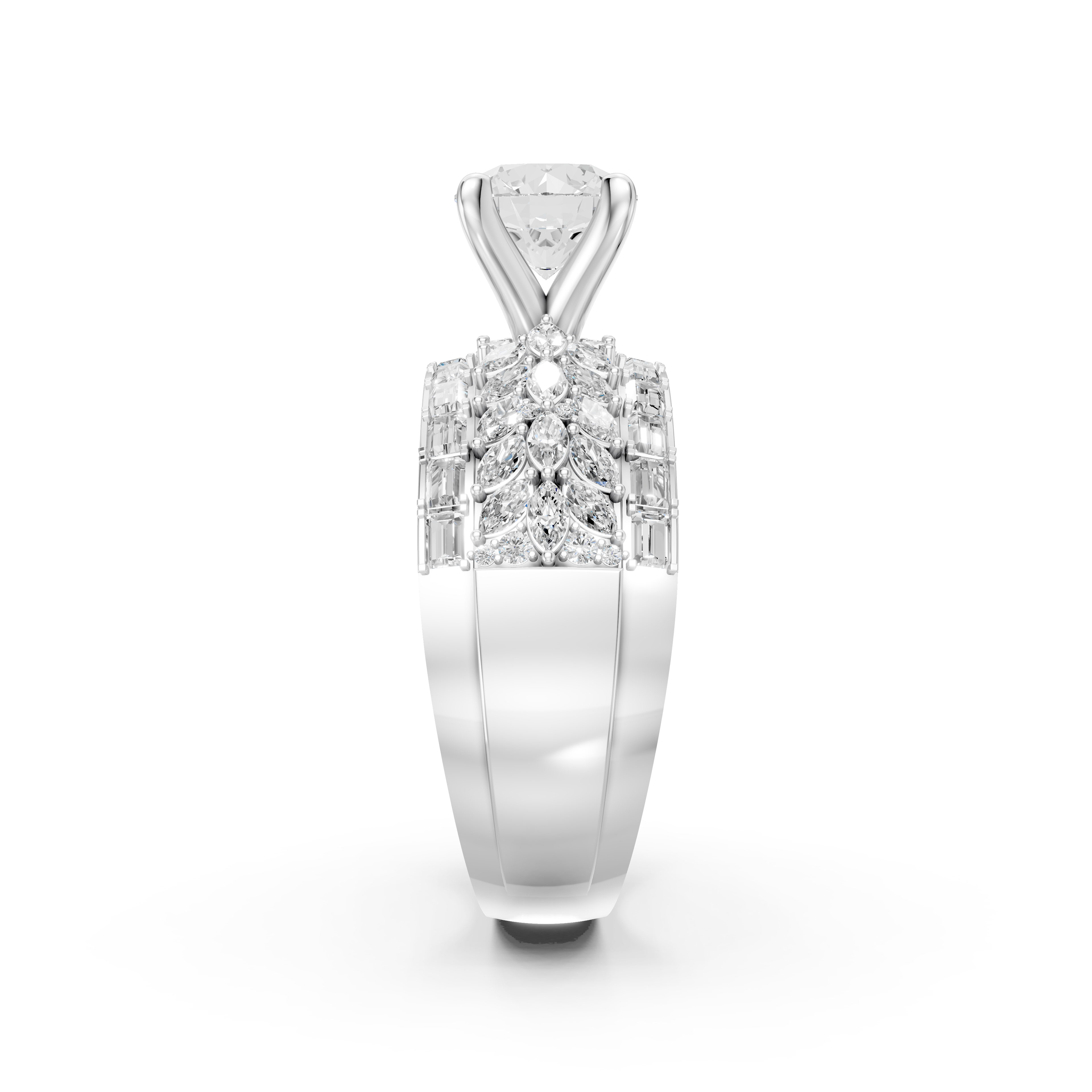 Với những chi tiết tinh xảo, chiếc nhẫn kim cương NN-0475 không chỉ là món trang sức mà còn là một tác phẩm nghệ thuật thu nhỏ, thể hiện sự tỉ mỉ và tay nghề cao trong chế tác riêng của nhà Vĩnh Cara. Kiểu dáng thiết kế Solitaire không chỉ giúp chiếc nhẫn thêm thanh lịch mà còn tôn viên chủ một cách hoàn hảo. Vỏ nhẫn nữ NN-0475 tỏa sáng với một viên kim cương chủ đính trên 4 chấu chắc chắn. Phần đai nhẫn to bản với sự kết hợp hài hảo của các viên kim cương tấm Round, Baguette và Marquise. Mẫu nhẫn kim cương này tạo nên một tổng thể vô cùng lấp lánh, đặc biệt khi có ánh nắng chiếu vào.