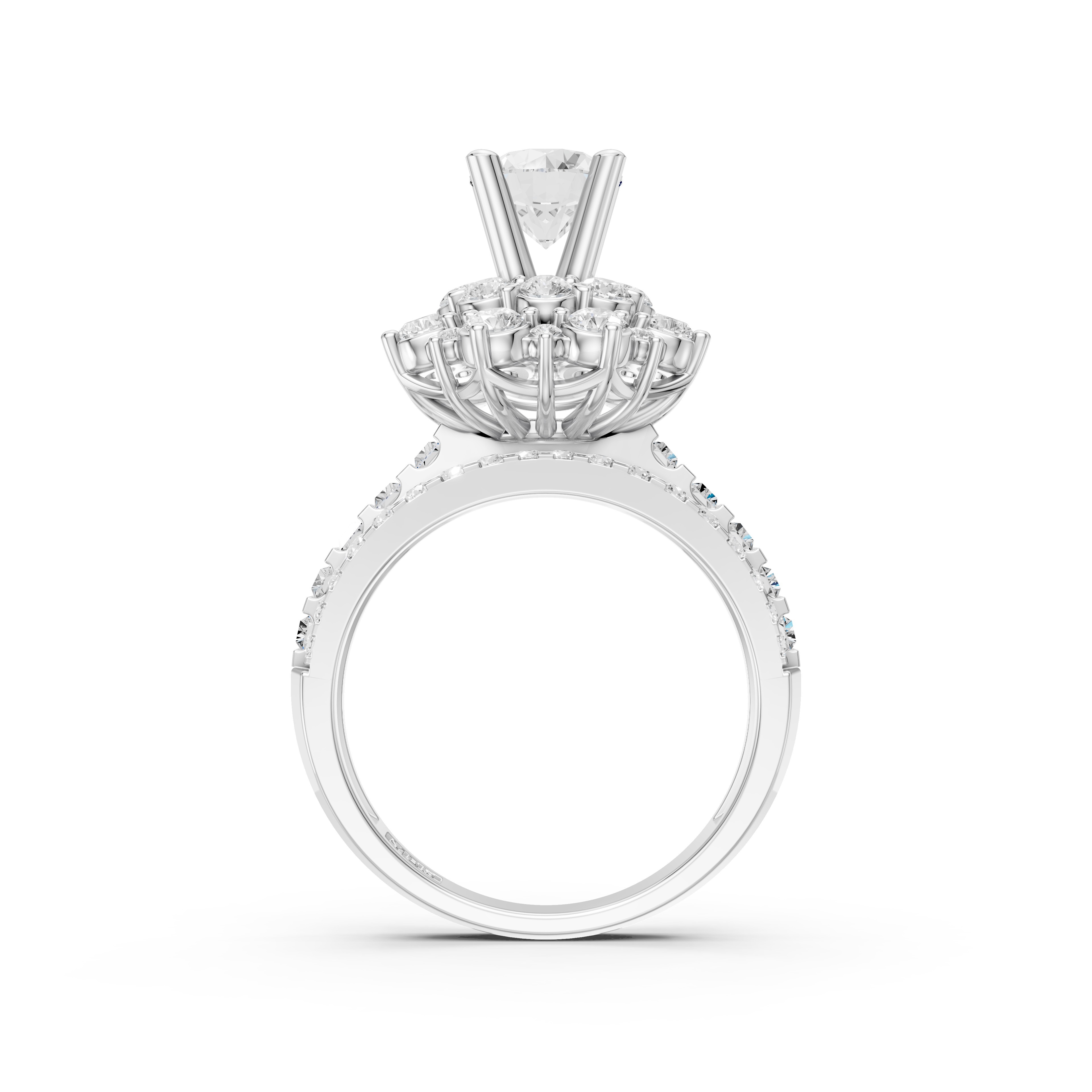 Chiếc nhẫn NN-0595 được thiết kế theo kiểu Cluster cầu kỳ bởi đội ngũ nghệ nhân chế tác của nhà Vĩnh Cara, tạo nên món trang sức tinh xảo hơn, đẳng cấp hơn. Điểm nhấn nổi bật nhất chính là viên chủ Round nằm trên ổ chủ 5.5 ly, cố định bởi 4 chấu và bệ nhẫn tạo nên từ 2 tầng kim cương chắc chắn. Đai nhẫn được thiết kế lạ mắt, ở giữa là một hàng kim cương Baguette với những đường cắt gọn gàng được đặt liền kề, hai bên là dải kim cương tấm nhỏ xinh, lấp lánh được đính khéo léo và tỉ mỉ.