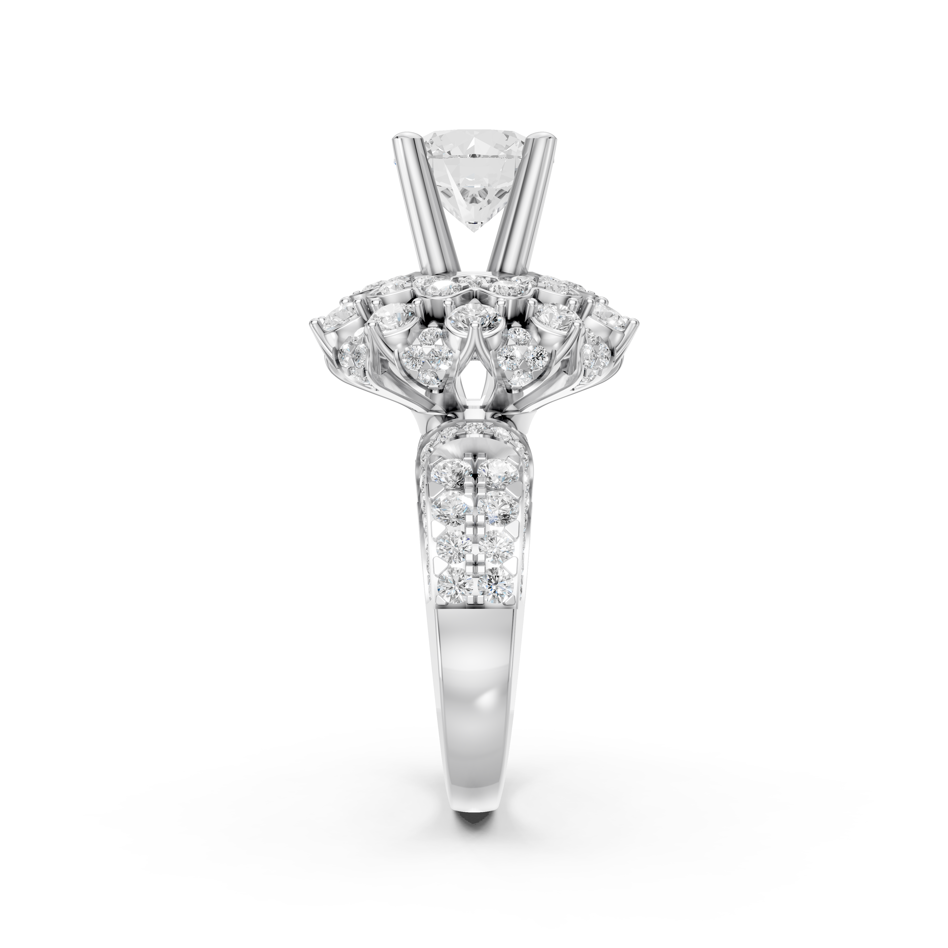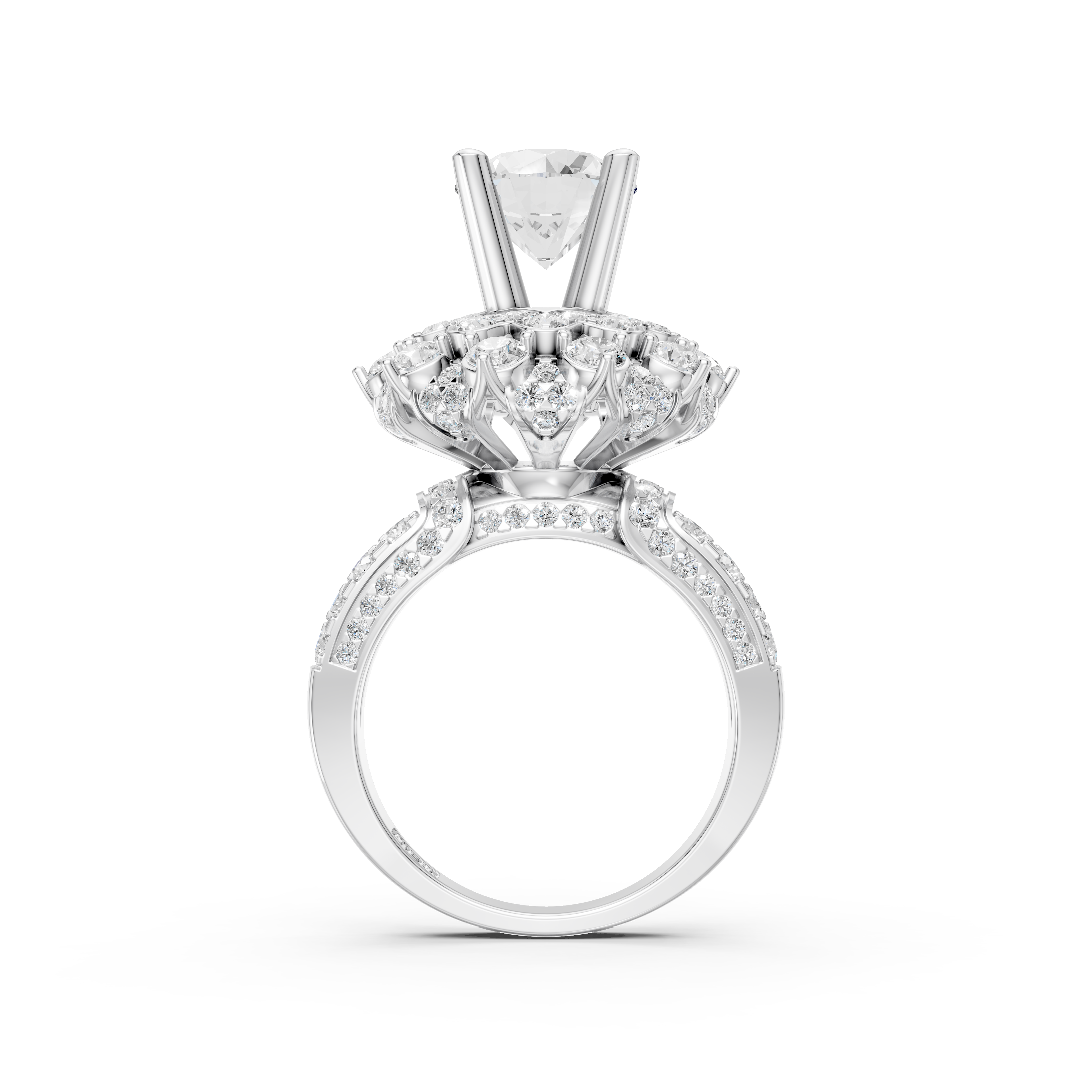 Ổ nhẫn được thiết kế cầu kỳ như một tòa sen đang nở rộ, tôn vinh viên chủ 8.0 ly nằm trên 4 chấu cao, làm nổi bật vẻ đẹp và sự lấp lánh của viên đá chính. Đai nhẫn và cạnh nhẫn đều được đính kim cương Round nhỏ, tỏa sáng lấp lánh ở mọi góc nhìn. 130 viên kim cương Round trong chiếc nhẫn nữ NN-0597 đều được chọn lựa kỹ lưỡng để đảm bảo độ trong suốt và khả năng phản chiếu ánh sáng hoàn hảo.