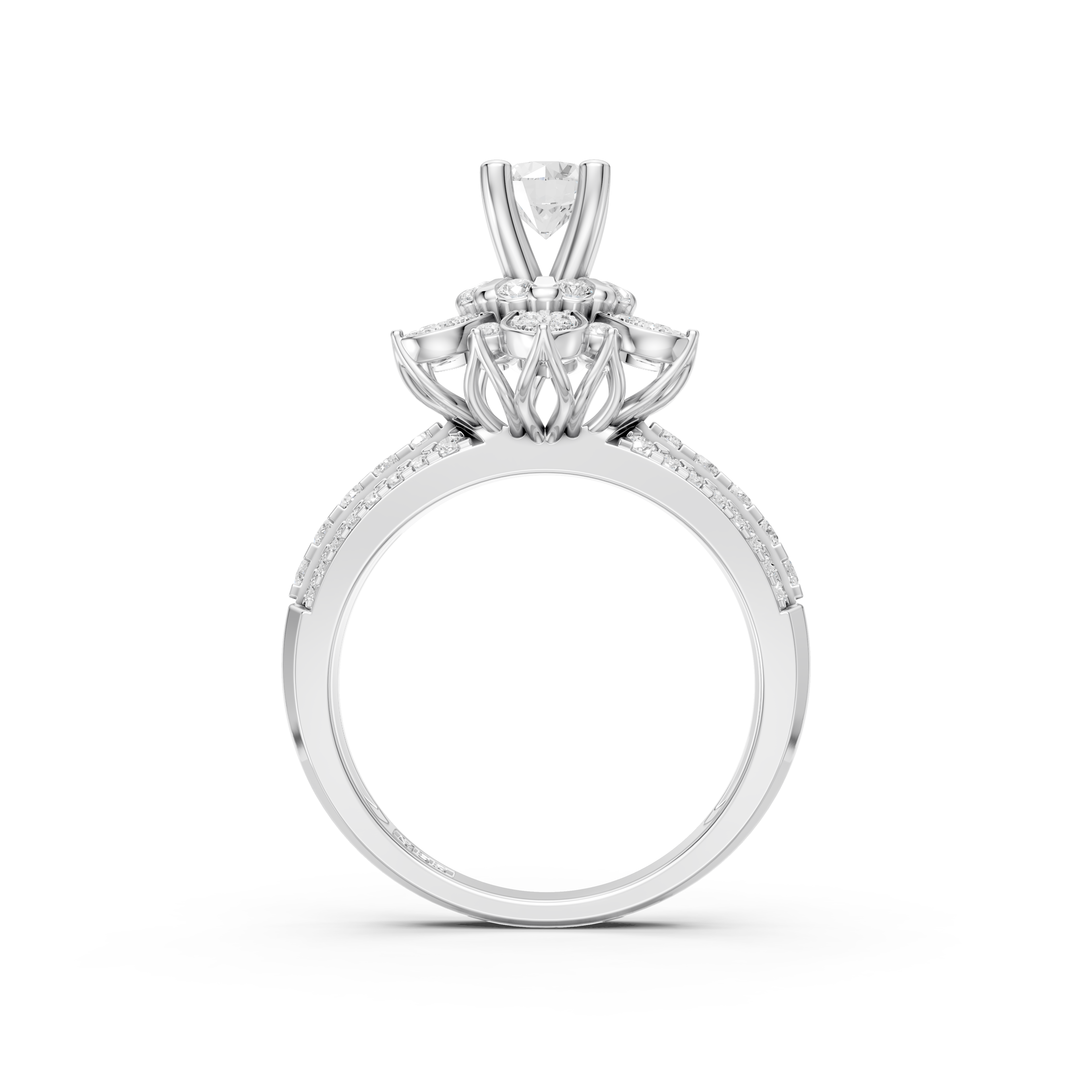 Thiết kế Cluster nổi bật: Viên kim cương chủ nổi bật tại vị trí trung tâm, được bao bọc bởi hai tầng kim cương tạo thành hình bông hoa đang nở rộ. Đai nhẫn đính ba hàng kim cương tấm mini, thoạt nhìn giống như những bụi hoa nhỏ xinh được trồng ngay ngắn và xinh xắn.