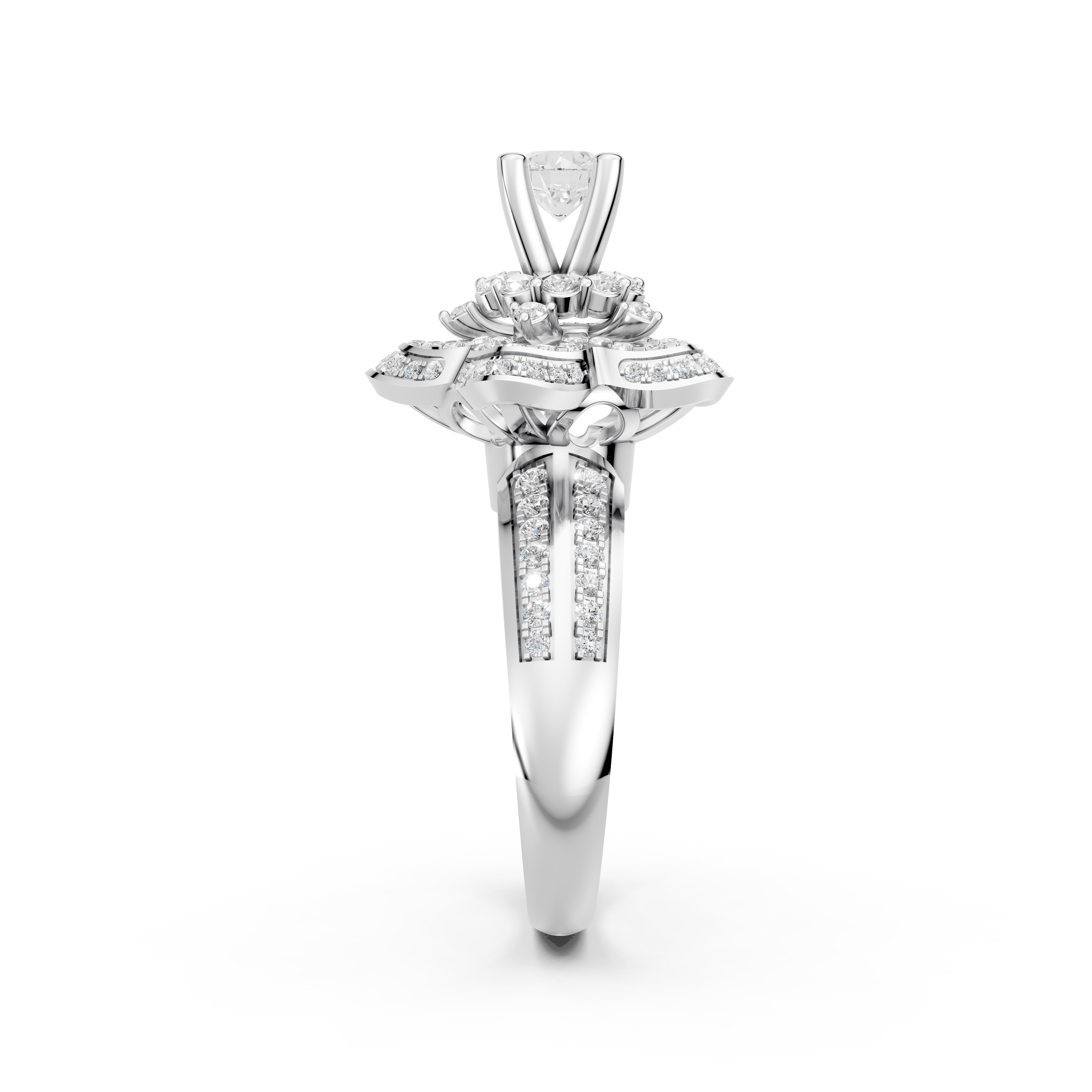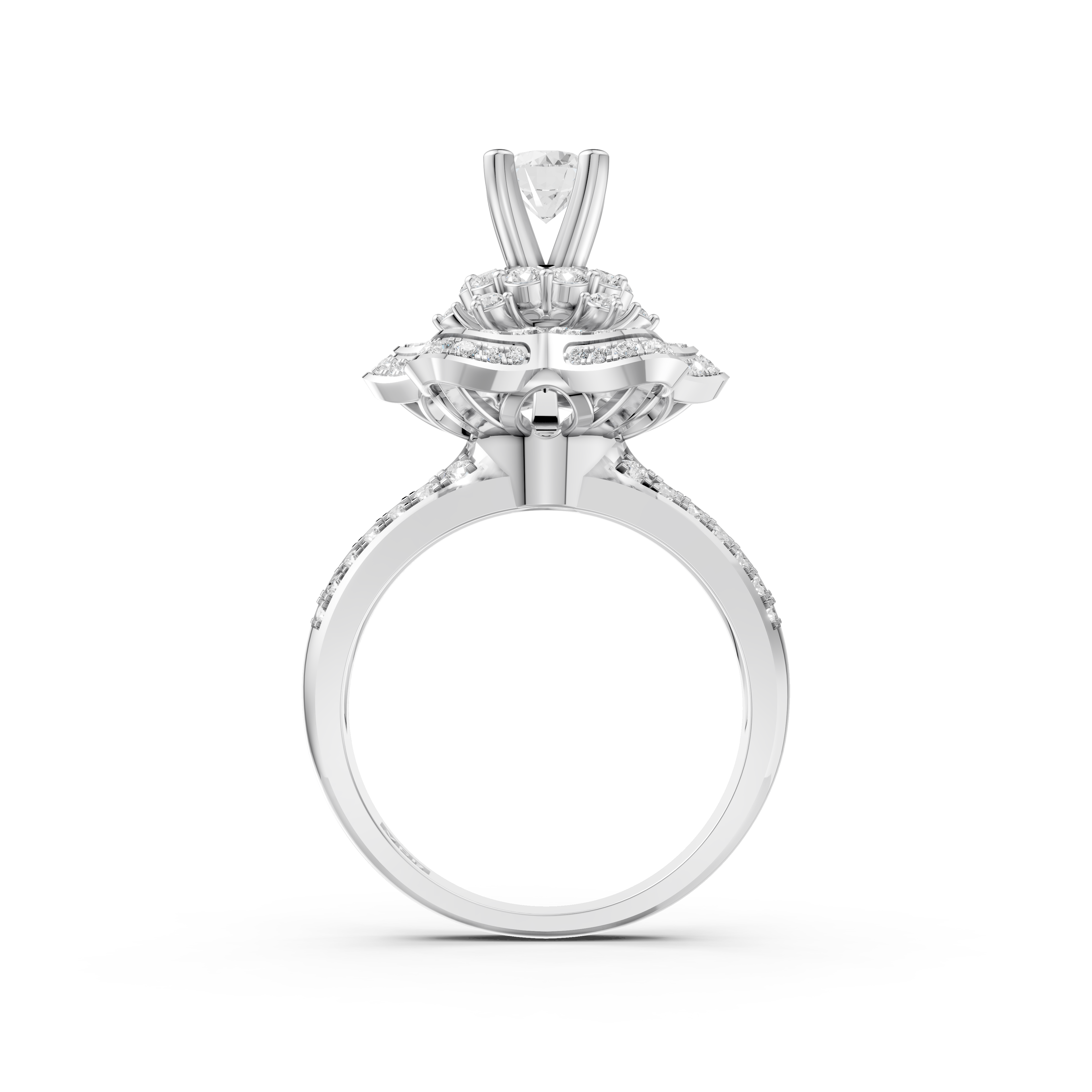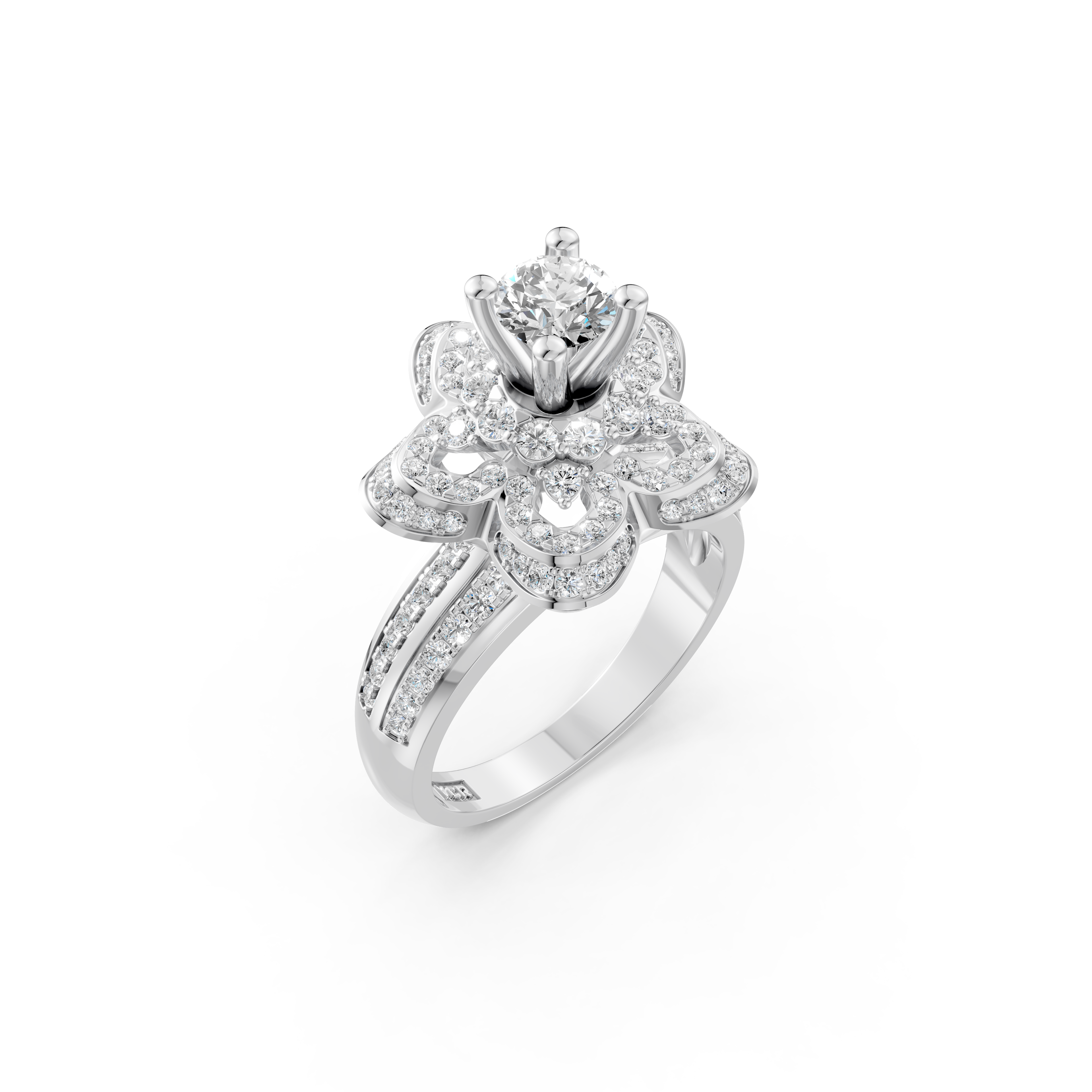 Kiểu dáng tinh xảo: Đai nhẫn nổi bật với hai dãy kim cương nhỏ, hai bên đối xứng tạo nên kết cấu hài hòa, tinh tế. Từ vỏ nhẫn lên đến ổ nhẫn được thiết kế như một bông hoa lớn, mỗi cánh hoa đều nạm vô số viên kim cương nhỏ xinh.