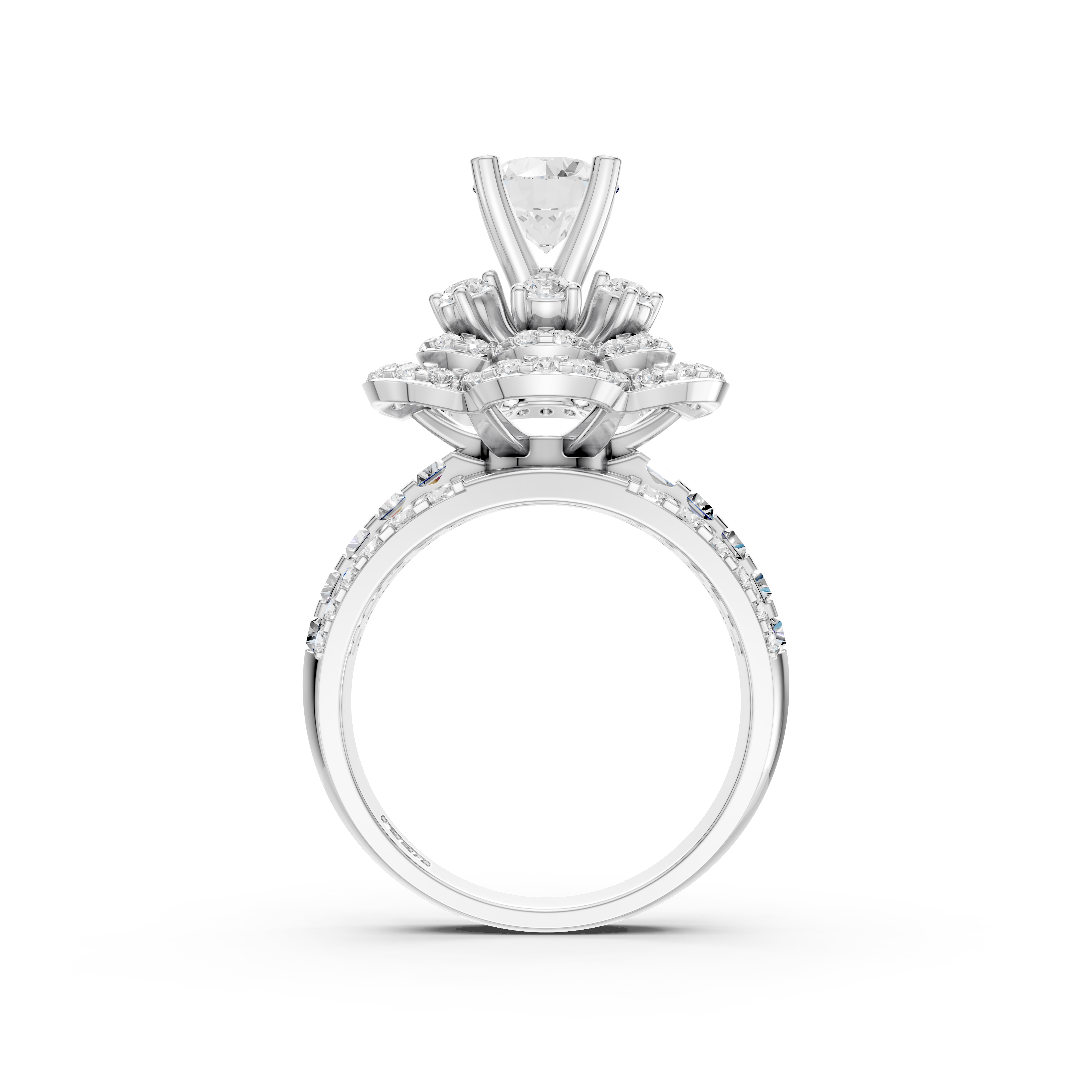 Vỏ nhẫn nữ Kim cương Vàng trắng 18K VCR NN-0764 gây ấn tượng với viên chủ kích thước 6 ly, dáng tròn (Round). Viên hột xoàn được nâng cao đầy tinh tế, trở thành tâm điểm của bông hoa quý. Xung quanh đó là 100 viên kim cương phụ dáng Round và Baguette, với các kích thước 1.1x2.1mm và 1.9x1.5mm, được đính tỉ mỉ từng lớp, mô phỏng các cánh hoa mềm mại.