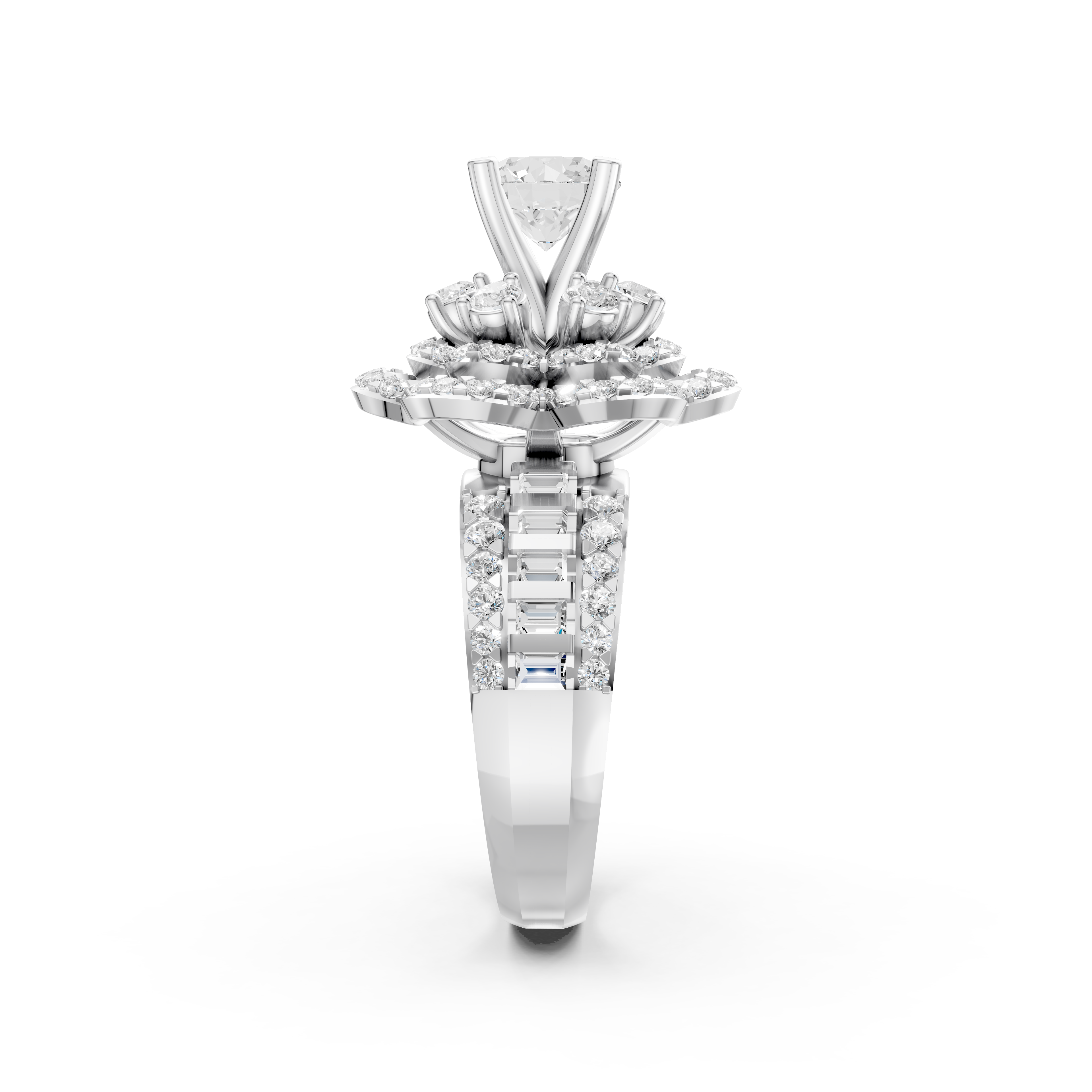 Không dừng lại ở phần mặt nhẫn, đai nhẫn cũng được khảm đều các viên baguette, tạo nên hiệu ứng ánh sáng trải dài liên tục từ đỉnh xuống thân. Điều này góp phần đáng kể trong việc làm tăng độ lấp lánh cho tổng thể, khiến đôi tay người đeo thêm cuốn hút mỗi khi cử động.
