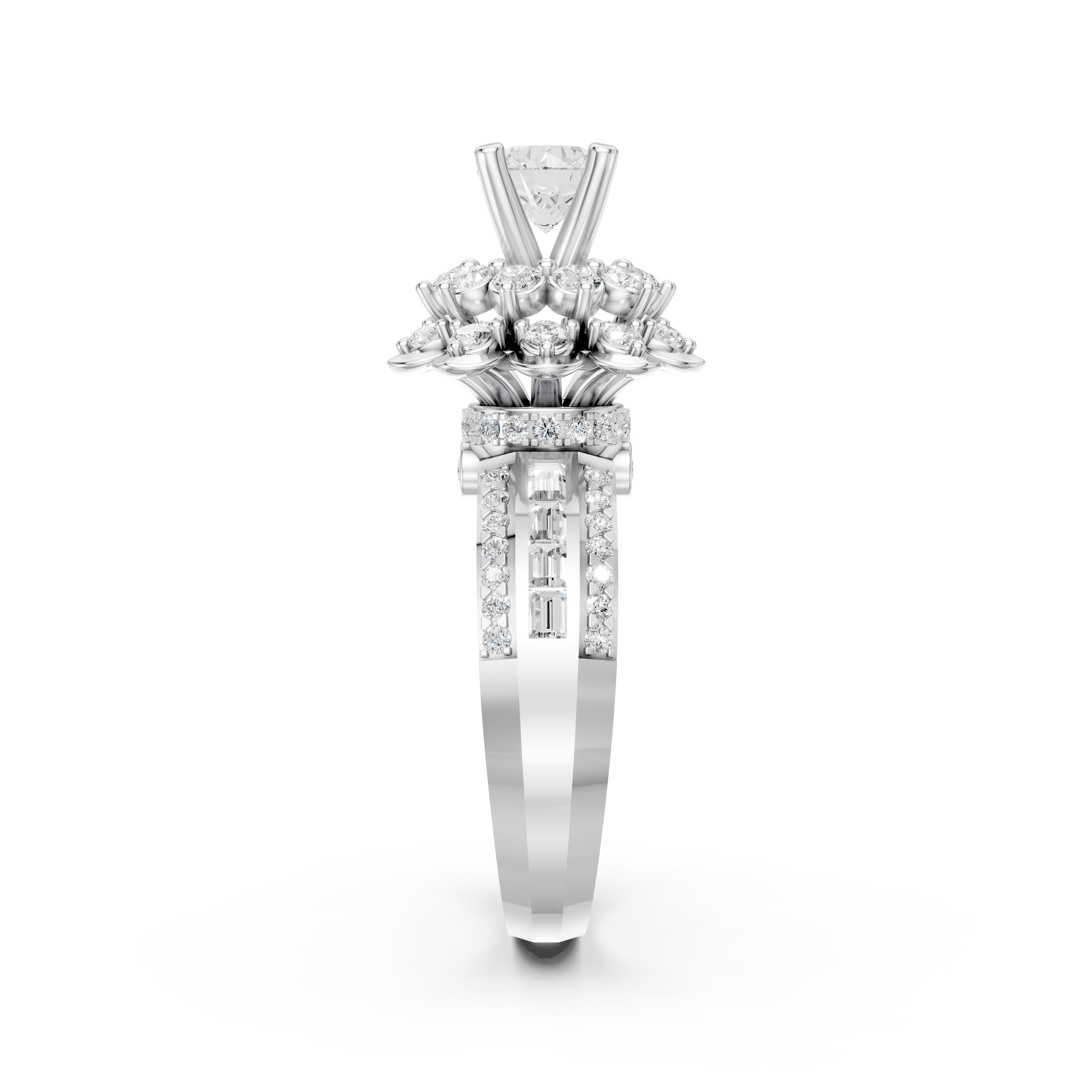 Đá chủ nằm ở trung tâm được bao quanh bởi những viên kim cương phụ nhỏ hơn, tạo thành một cụm lấp lánh như ngôi sao rực rỡ. Vỏ nhẫn sở hữu 74 viên kim cương cao cấp, đính kết thành hình cánh hoa và trải dọc theo đai nhẫn. Kiểu dáng này vừa giúp tối đa hóa độ lấp lánh, vừa tạo cảm giác viên chủ có kích thước lớn hơn thực tế, mang đến hiệu ứng thị giác đầy ấn tượng.
