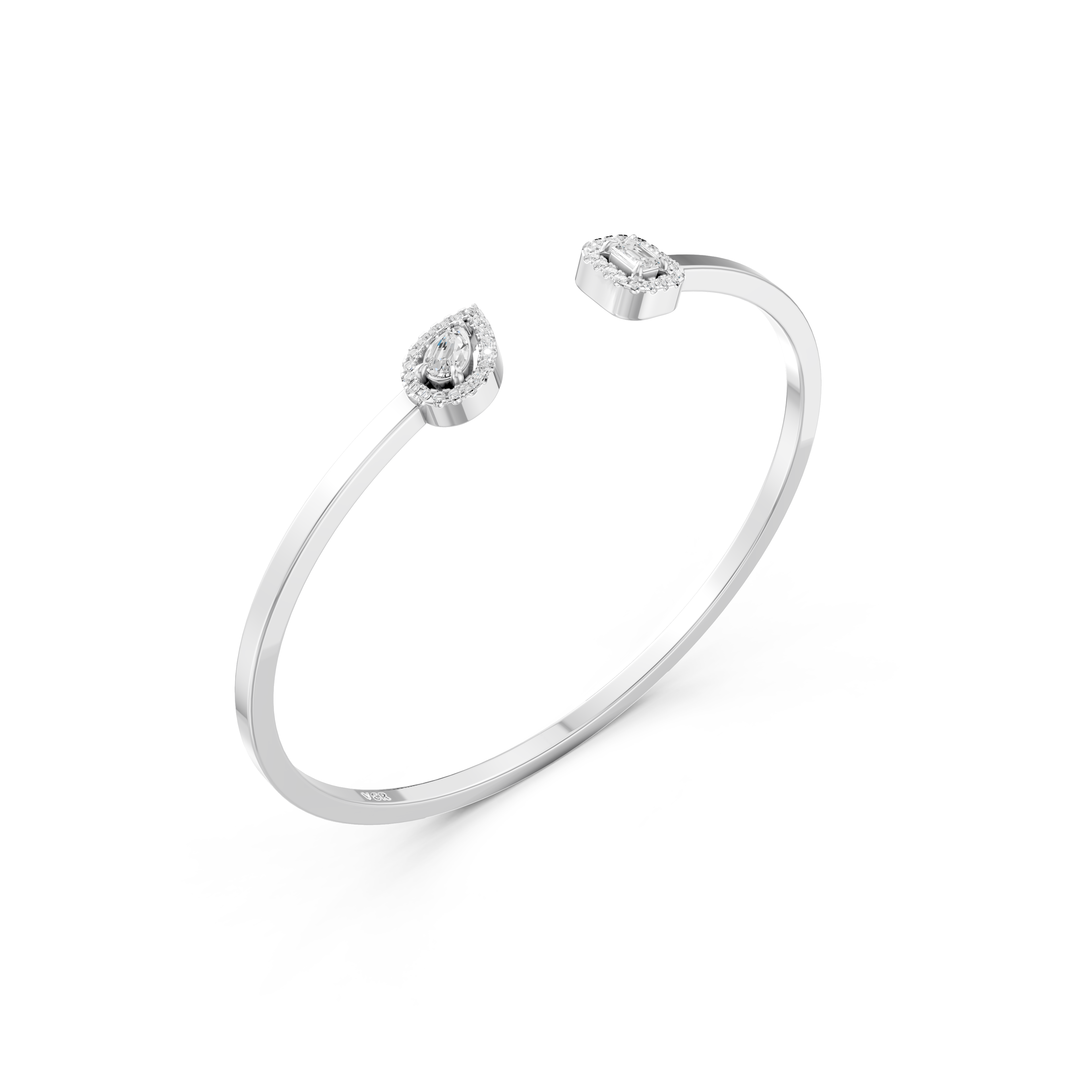 Mẫu vòng tay kim cương VN-0079 với thiết kế cuff cực kỳ độc đáo và phá cách, kiểu dáng mới lạ với một đầu là viên đá hình tròn và một đầu là viên đá hình giọt nước được phủ đầy kim cương tự nhiên lấp lánh, tạo nên vẻ đẹp tinh xảo hơn và đẳng cấp hơn cho sản phẩm. Phần thân vòng tay là một dải vàng trắng sáng bóng tạo ra hiệu ứng bắt mắt trên cổ tay thon thả của các cô nàng hiện đại. Chiếc vòng này phù hợp với nhiều kích cỡ cổ tay khác nhau và dễ dàng điều chỉnh để đeo vào hoặc tháo ra. Sự kết hợp giữa kim cương và vàng trắng mang đến vẻ ngoài cao cấp, phù hợp với nhiều phong cách.